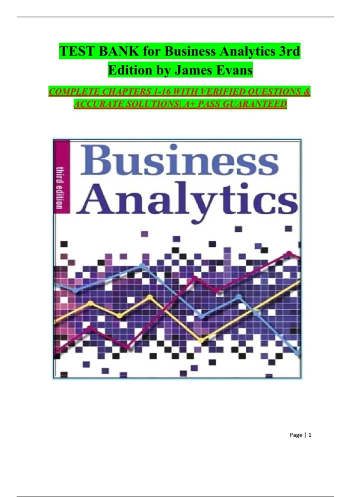 : This document provides the complete test bank for Business Analytics, 3rd Edition by James R. Evans. It includes multiple-choice, true/false, quantitative problems, and applied case-based questions with accurate solutions, fully covering chapters 1–16. Key topics include descriptive, predictive, and prescriptive analytics, data visualization, probability and statistics, forecasting, optimization models, decision analysis, simulation, and applications of analytics in business decision-making. This resource is ideal for exam preparation, practice, and mastering both theoretical and applied aspects of business analytics.
