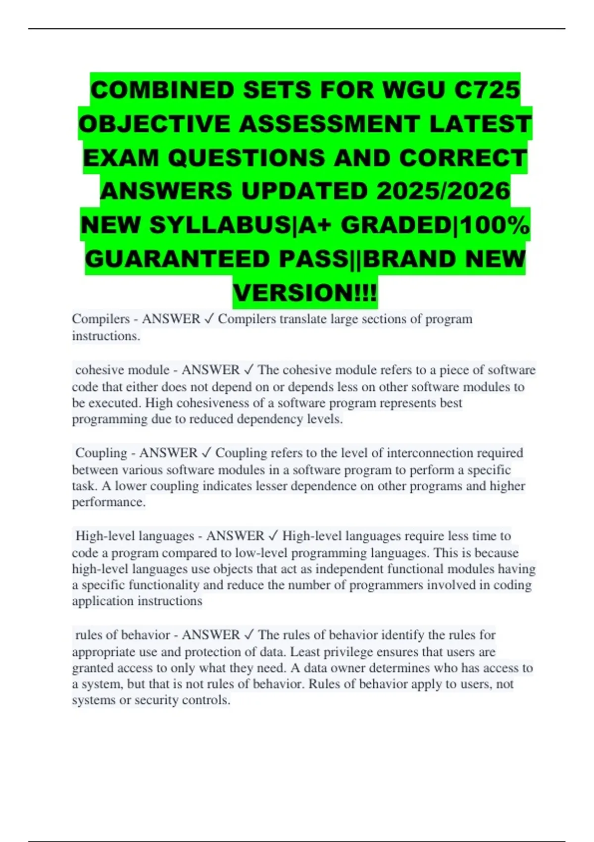 COMBINED SETS FOR WGU C725 OBJECTIVE ASSESSMENT LATEST EXAM QUESTIONS AND CORRECT ANSWERS UPDATED 2025/2026 NEW SYLLABUS|A+ GRADED|100% GUARANTEED PASS||BRAND NEW VERSION!!! Compilers - ANSWER Compilers translate large sections of program instructions. cohesive module - ANSWER The cohesive module refers to a piece of software code that either does not depend on or depends less on other software modules to be executed. High cohesiveness of a software program represents best programming due to reduced dependency levels. Coupling - ANSWER Coupling refers to the level of interconnection required between various software modules in a software program to perform a specific task. A lower coupling indicates lesser dependence on other programs and higher performance. High-level languages - ANSWER High-level languages require less time to code a program compared to low-level programming languages. This is because high-level languages use objects that act as independent functional modules having a specific functionality and reduce the number of programmers involved in coding application instructions rules of behavior - ANSWER The rules of behavior identify the rules for appropriate use and protection of data. Least privilege ensures that users are granted access to only what they need. A data owner determines who has access to a system, but that is not rules of behavior. Rules of behavior apply to users, not systems or security controls. Bind variable - ANSWER The Bind variable is used to enhance the database performance by allowing a single statement to execute multiple variables. Bind variables are placeholders for values sent to a database server in a SQL query. Bind variables permit the reuse of previously issued SQL statements by executing a prepared set of instructions with the parameters provided at runtime. data control language (DCL). - ANSWER Database security is implemented by data control language (DCL). Database normalization - ANSWER Database normalization is a process of deleting duplicate data from a database. Normalization ensures that the attributes in a table depend only on the primary key. Substitute variables - ANSWER Substitute variables are used to replace values in SQL PLUS commands. How is the Building Security in Maturity Model (BSIMM) used to measure the maturity of a software assurance program? - ANSWER By looking for evidence of security activities in the SDLC