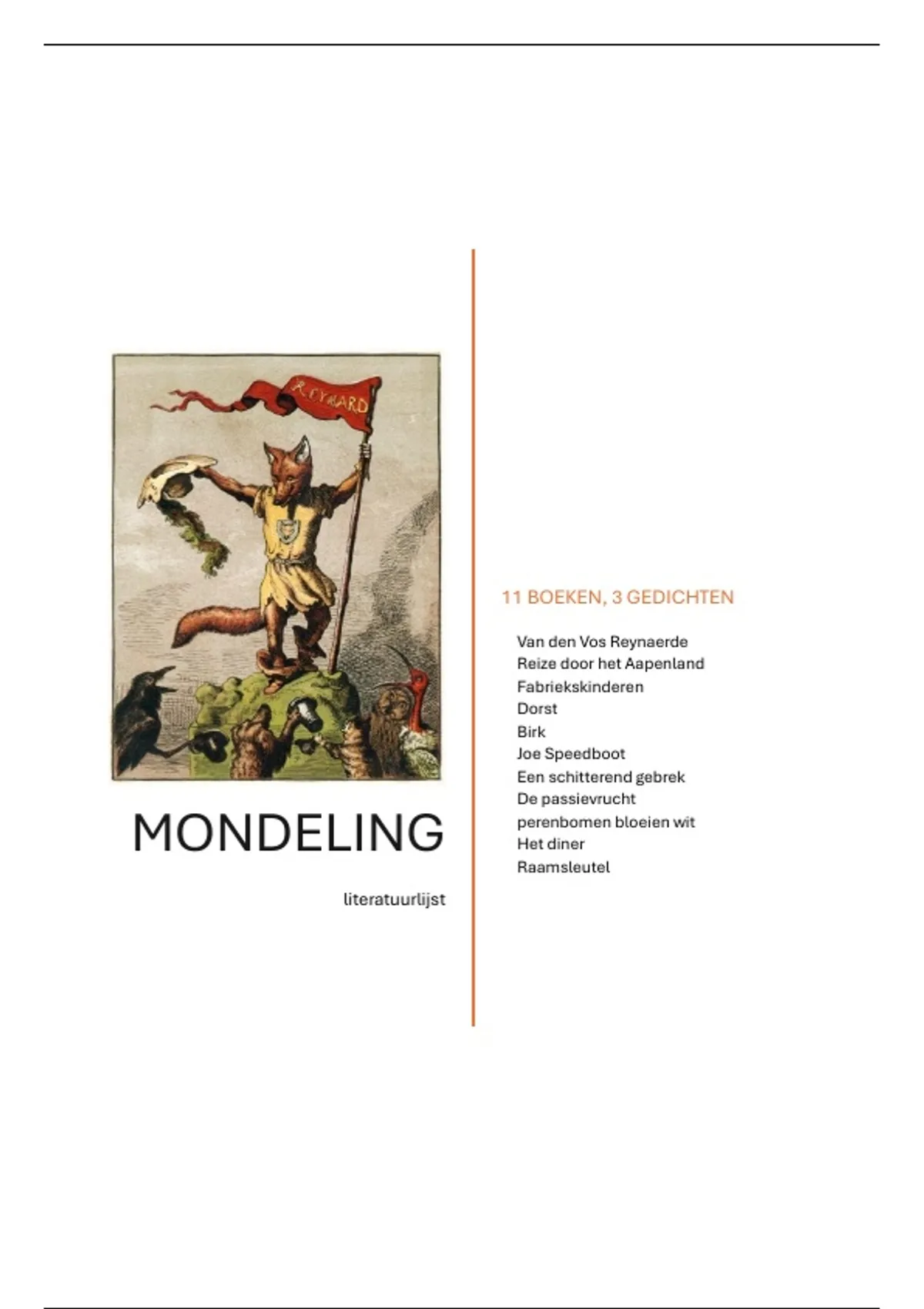 Hoi, in dit document vind je samenvattingen die ik gemaakt heb ter voorbereiding om mijn mondeling voor Nederlands in 6 vwo. Het document bevat 11 boeken, let op de ene samenvatting is minder uitgebreid dan de andere. van de vos Reynaerde is de grootste samenvatting in dit bestand. bij de drie gedichten staat ook een uitleg waarom ik de gedichten bij een bepaald boek vind passen. De volgende boeken komen aan bod: Van den Vos Reynaerde Reize door het Aapenland Fabriekskinderen Dorst Birk Joe Speedboot Een schitterend gebrek De passievrucht perenbomen bloeien wit Het diner Raamsleutel Ik heb uiteindelijk een 8 gehaald voor mijn mondeling met behulp van dit bestand. Mocht je maar van een paar boeken de samenvatting willen? Ik plaats de samenvattingen ook los en in voordeelbundels. Staat jouw combinatie van boeken niet in een voordeelbundel, stuur gerust een bericht dan maak ik dat voor je aan!