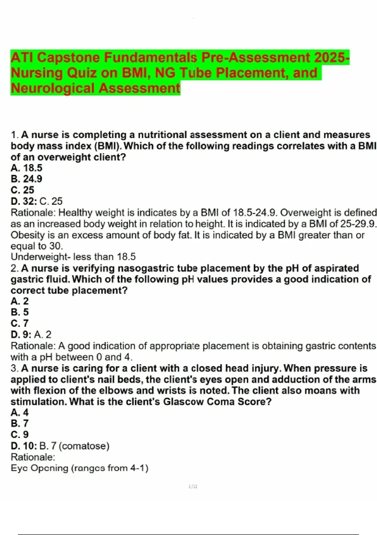 ATI Capstone Fundamentals Pre-Assessment 2025-Nursing Quiz on BMI, NG Tube Placement, and Neurological A ATI Capstone Fundamentals Pre-Assessment 2025-Nursing Quiz on BMI, NG Tube Placement, and Neurological A ATI Capstone Fundamentals Pre-Assessment 2025-Nursing Quiz on BMI, NG Tube Placement, and Neurological A