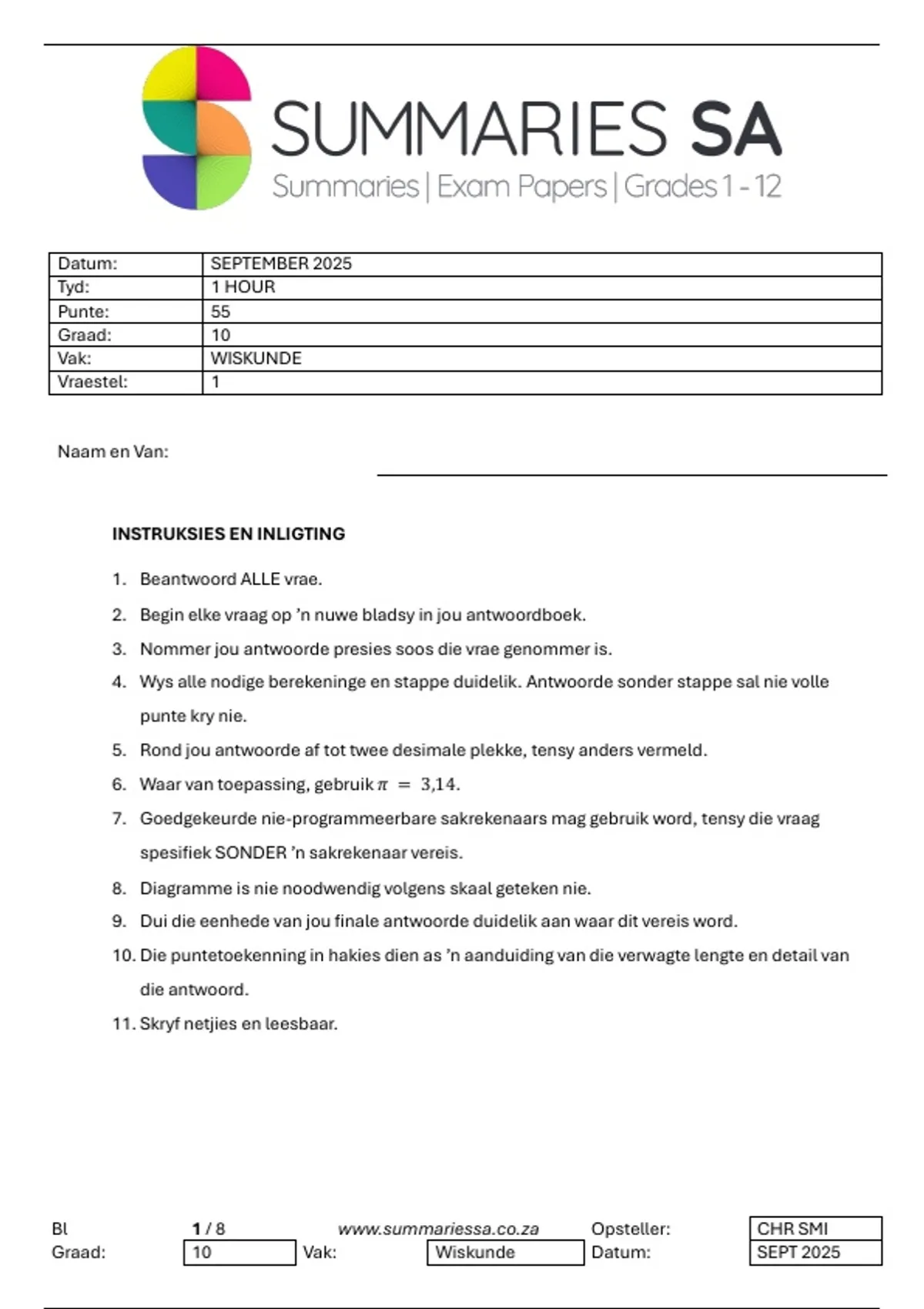 Graad: 10 Vak: Wiskunde Datum: SEPT 2025