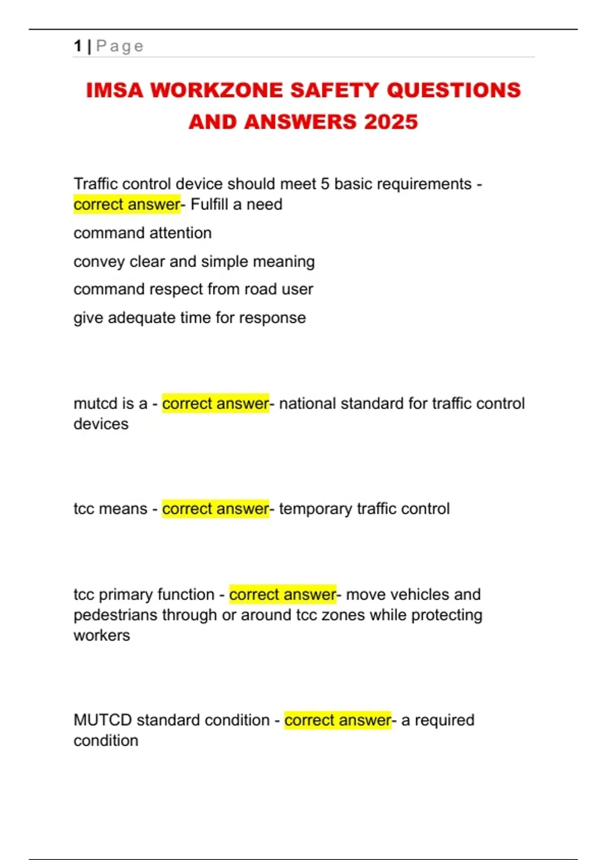 IMSA WORKZONE SAFETY QUESTIONS AND ANSWERS 2025