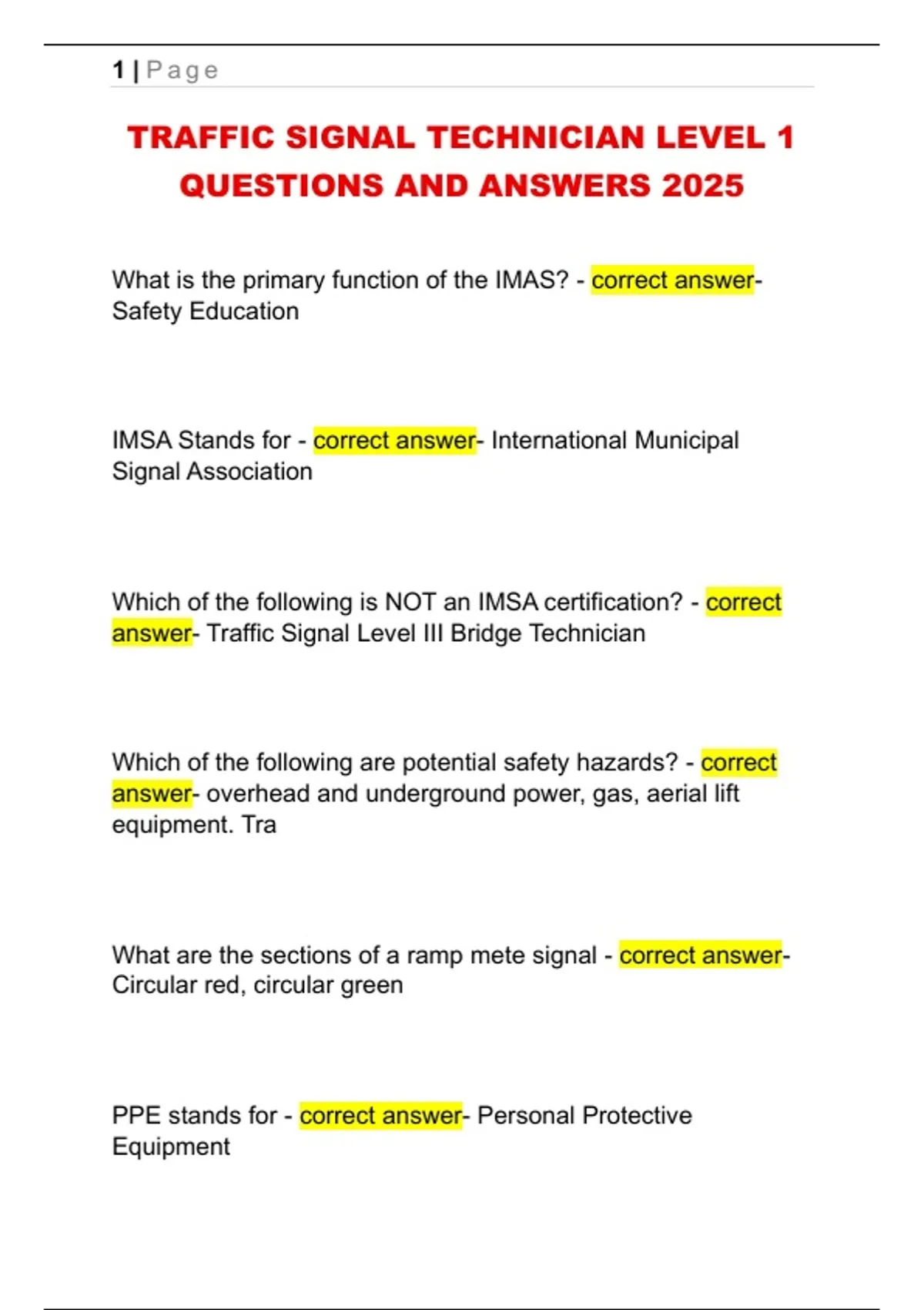 TRAFFIC SIGNAL TECHNICIAN LEVEL 1 QUESTIONS AND ANSWERS 2025