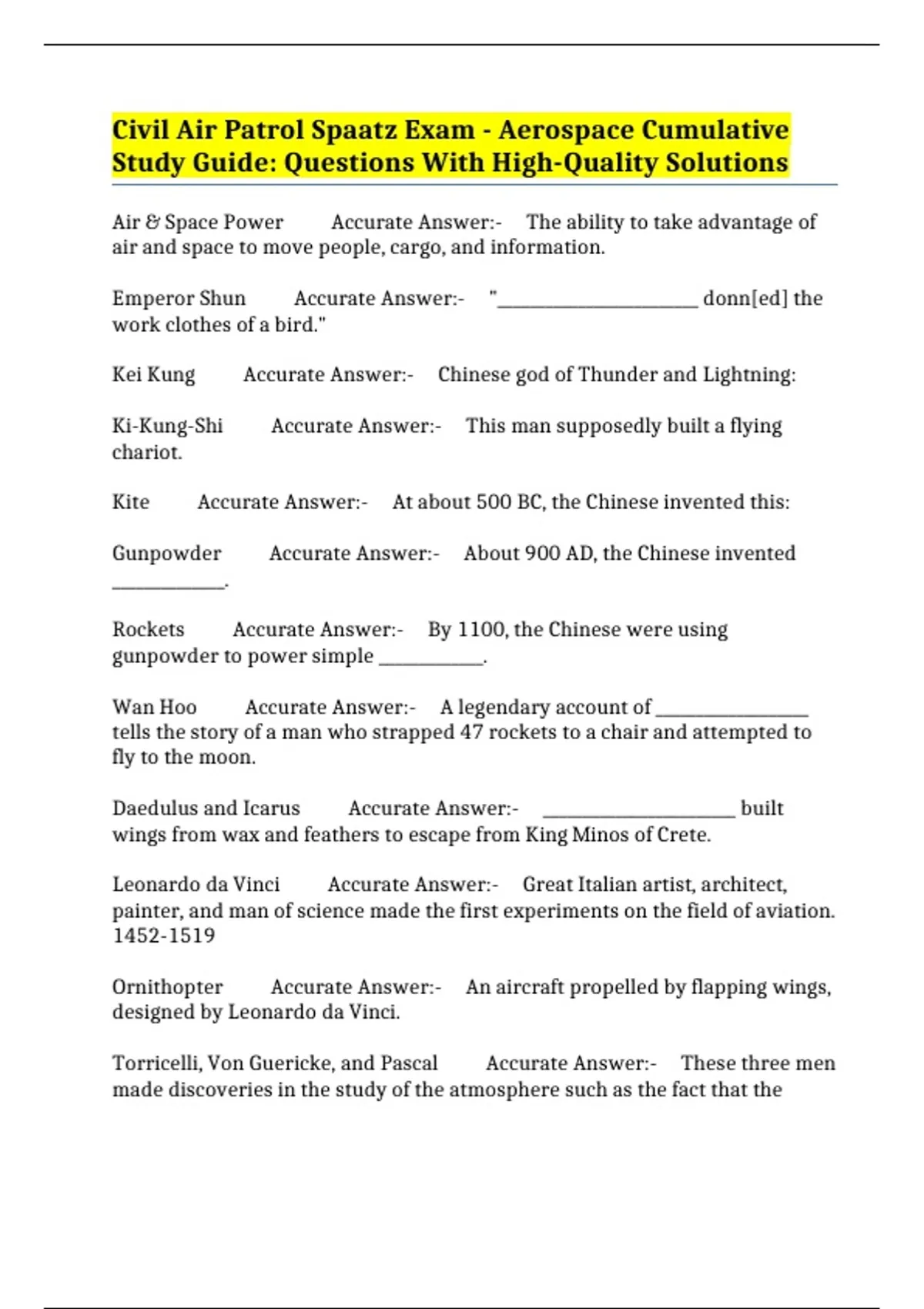 Civil Air Patrol Spaatz Exam - Aerospace Cumulative Study Guide: Questions With High-Quality Solutions