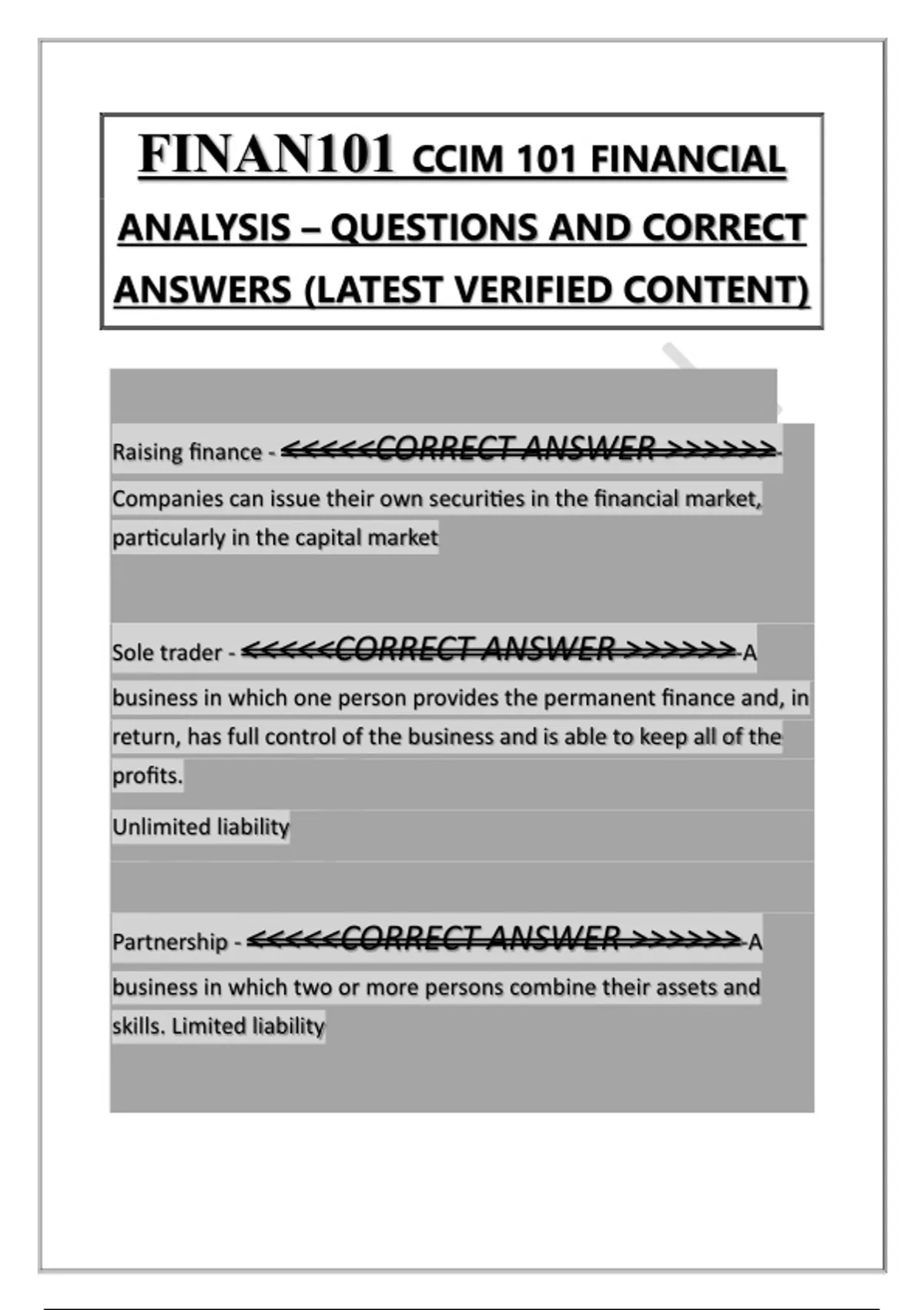 FINAN101 CCIM 101 FINANCIAL ANALYSIS – QUESTIONS AND CORRECT ANSWERS (LATEST VERIFIED CONTENT) Raising finance - <<<<<CORRECT ANSWER >>>>>> Companies can issue their own securities in the financial market, particularly in the capital market Sole trader - <<<<<CORRECT ANSWER >>>>>>-A business in which one person provides the permanent finance and, in return, has full control of the business and is able to keep all of the profits. Unlimited liability Partnership - <<<<<CORRECT ANSWER >>>>>>-A business in which two or more persons combine their assets and skills. Limited liability Company - <<<<<CORRECT ANSWER >>>>>> Independent legal entity able to do business in its own right. Businesses owned by shareholders with limited liability. Can be listed on the public stock exchange Commercial banks - <<<<<CORRECT ANSWER >>>>>>-Privately owned financial institutions that accept demand deposits and make loans and provide other services for the public. offer the widest range of services to businesses. Insurance companies - <<<<<CORRECT ANSWER >>>>>>-Provide funding to companies through the purchase of shares and bonds in the direct finance markets and fund private companies through private placement funding Investment funds - <<<<<CORRECT ANSWER >>>>>> Sells shares to investors and use the funds to purchase a wide variety of direct and indirect financial instruments