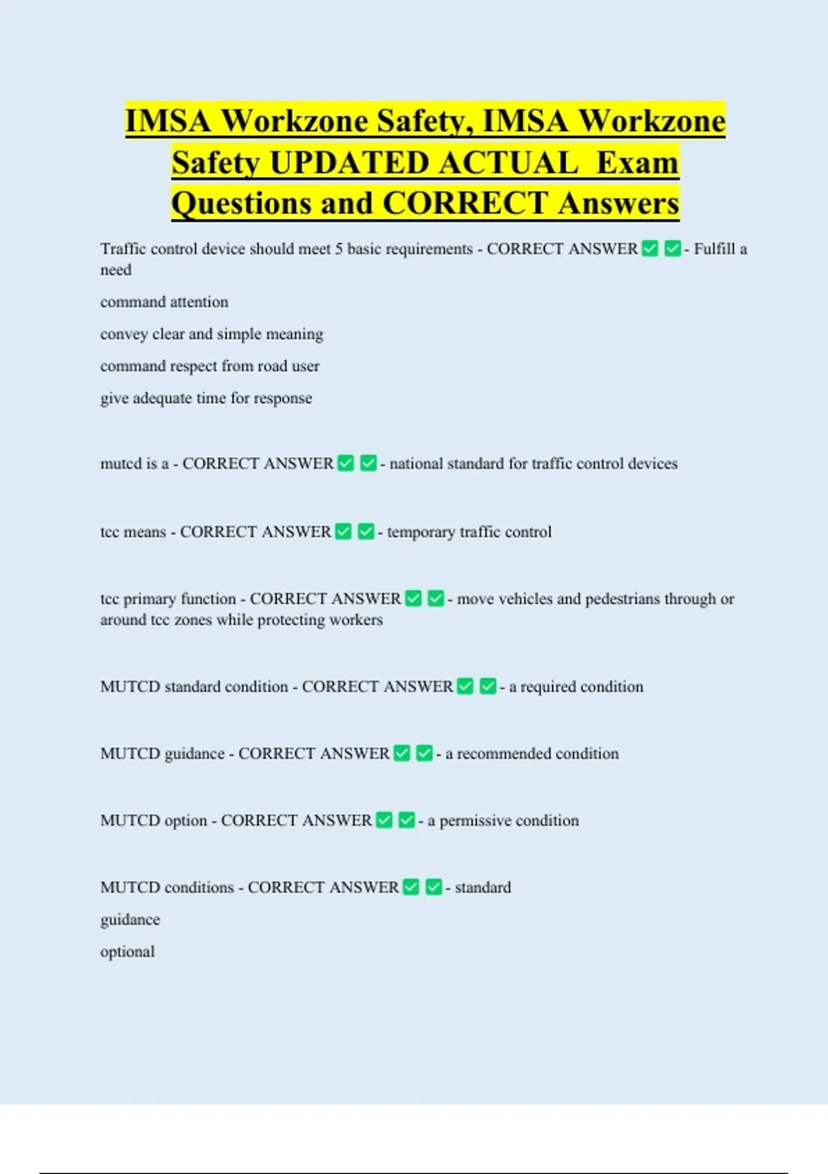 IMSA Workzone Safety, IMSA Workzone Safety UPDATED ACTUAL Exam Questions and CORRECT Answers Traffic control device should meet 5 basic requirements - CORRECT ANSWER need command attention convey clear and simple meaning command respect from road user give adequate time for response mutcd is a - CORRECT ANSWER tcc means - CORRECT ANSWER - national standard for traffic control devi