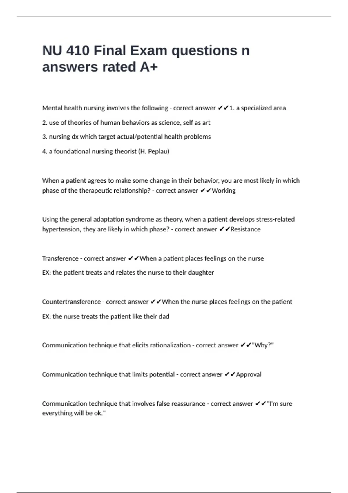 Mental health nursing involves the following - correct answer ✔✔1. a specialized area