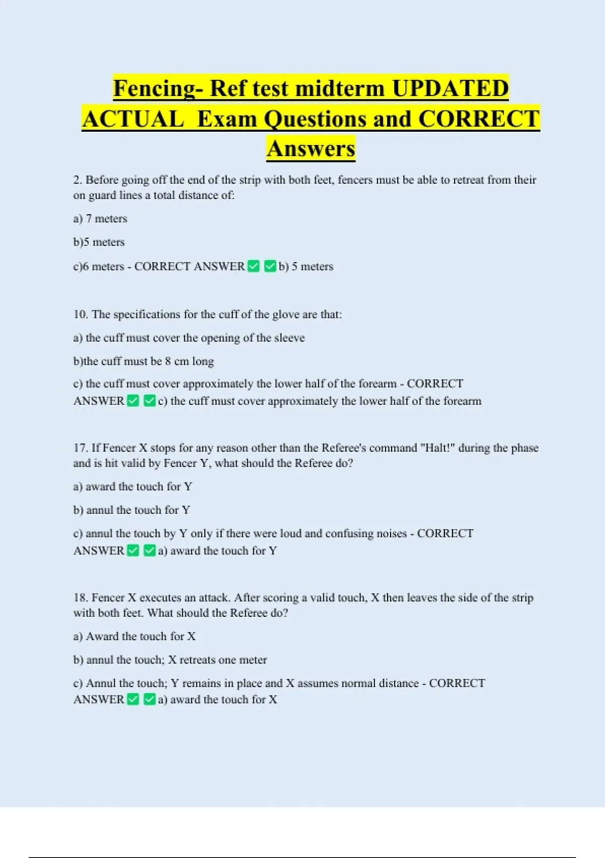 Fencing- Ref test midterm UPDATED ACTUAL Exam Questions and CORRECT Answers 2. Before going off the end of the strip with both feet, fencers must be able to retreat from their on guard lines a total distance of: a) 7 meters b)5 meters c)6 meters - CORRECT ANSWER b) 5 meters 10. The specifications for the cuff of the glove are that: