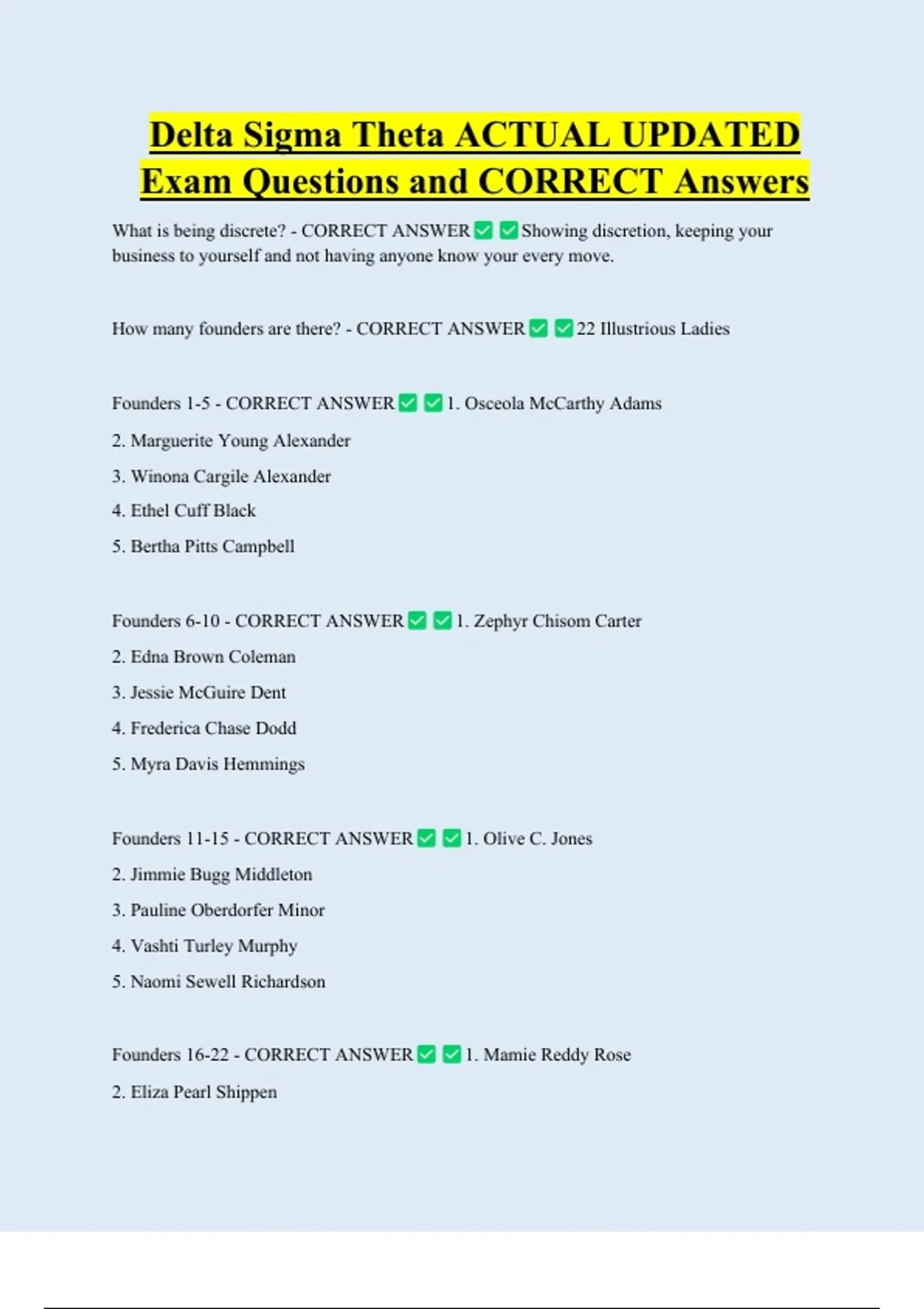 Delta Sigma Theta ACTUAL UPDATED Exam Questions and CORRECT Answers What is being discrete? - CORRECT ANSWER Showing discretion, keeping your business to yourself and not having anyone know your every move. How many founders are there? - CORRECT ANSWER Founders 1-5 - CORRECT ANSWER 22 Illustrious Ladies 1. Osceola McCarthy Adams