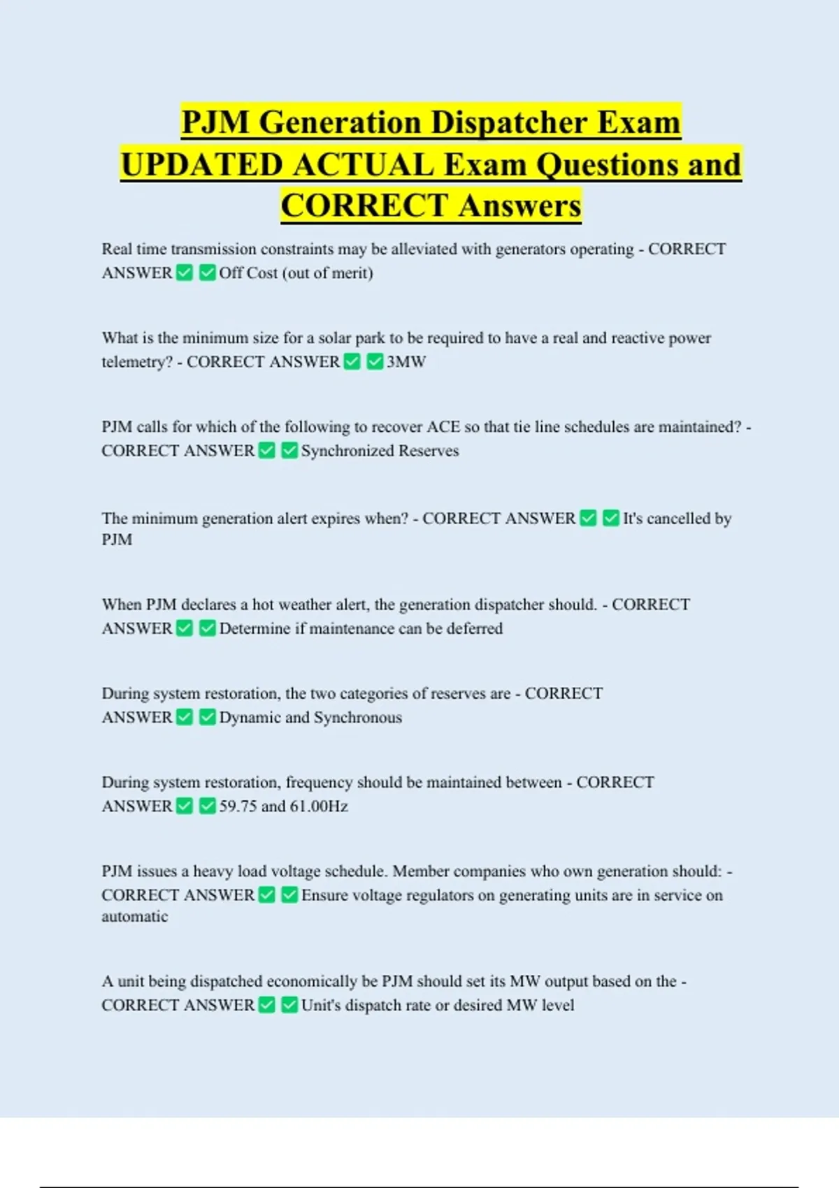 PJM Generation Dispatcher Exam UPDATED ACTUAL Exam Questions and CORRECT Answers Real time transmission constraints may be alleviated with generators operating - CORRECT ANSWER Off Cost (out of merit) What is the minimum size for a solar park to be required to have a real and reactive power telemetry? - CORRECT ANSWER 3MW PJM calls for which of the following to recover ACE so that tie line schedules are maintained? - CORRECT ANSWER Synchronized Reserves