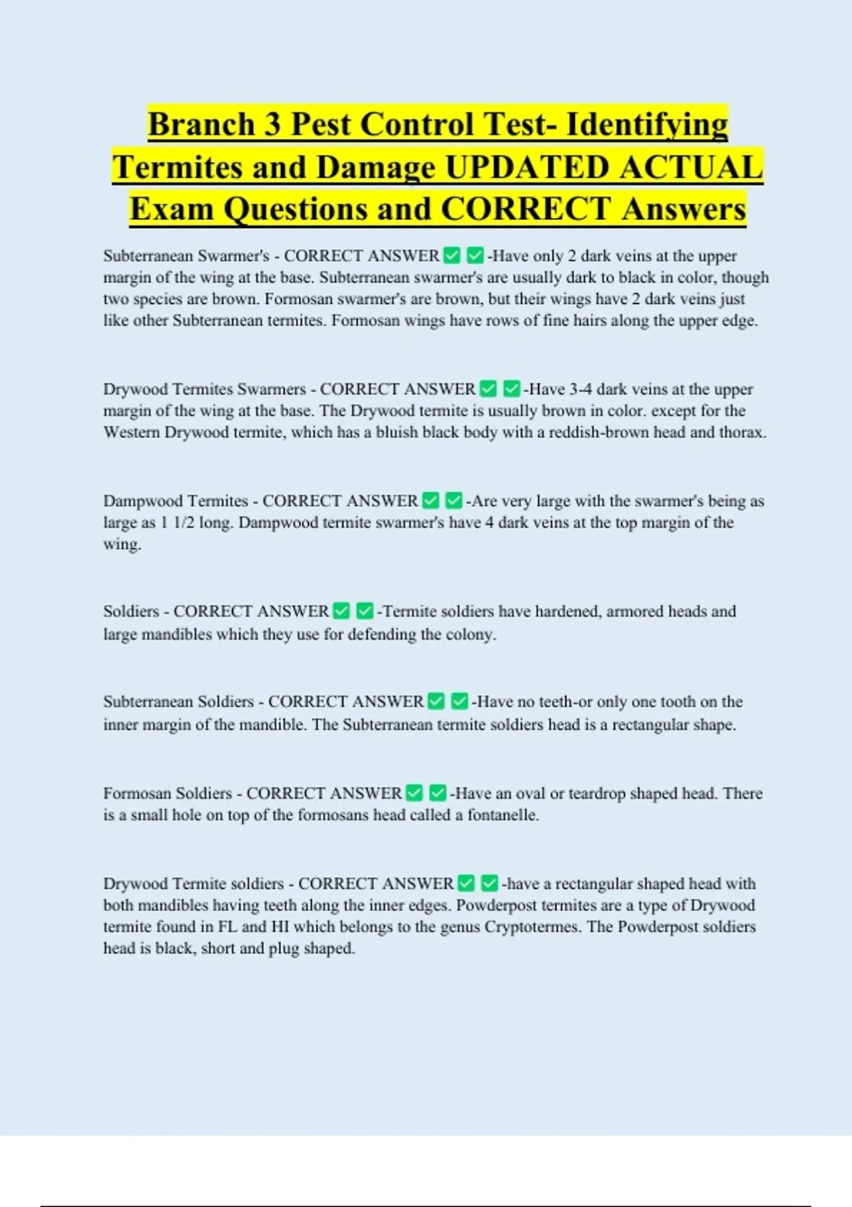 Branch 3 Pest Control Test- Identifying Termites and Damage UPDATED ACTUAL Exam Questions and CORRECT Answers Subterranean Swarmer's - CORRECT ANSWER -Have only 2 dark veins at the upper margin of the wing at the base. Subterranean swarmer's are usually dark to black in color, though two species are brown. Formosan swarmer's are brown, but their wings have 2 dark veins just like other Subterranean termites. Formosan wings have rows of fine hairs along the upper edge. Drywood Termites Swarmers - CORRECT ANSWER -Have 3-4 dark veins at the upper margin of the wing at the base. The Drywood termite is usually brown in color. except for the Western Drywood termite, which has a bluish black body with a reddish-brown head and tho
