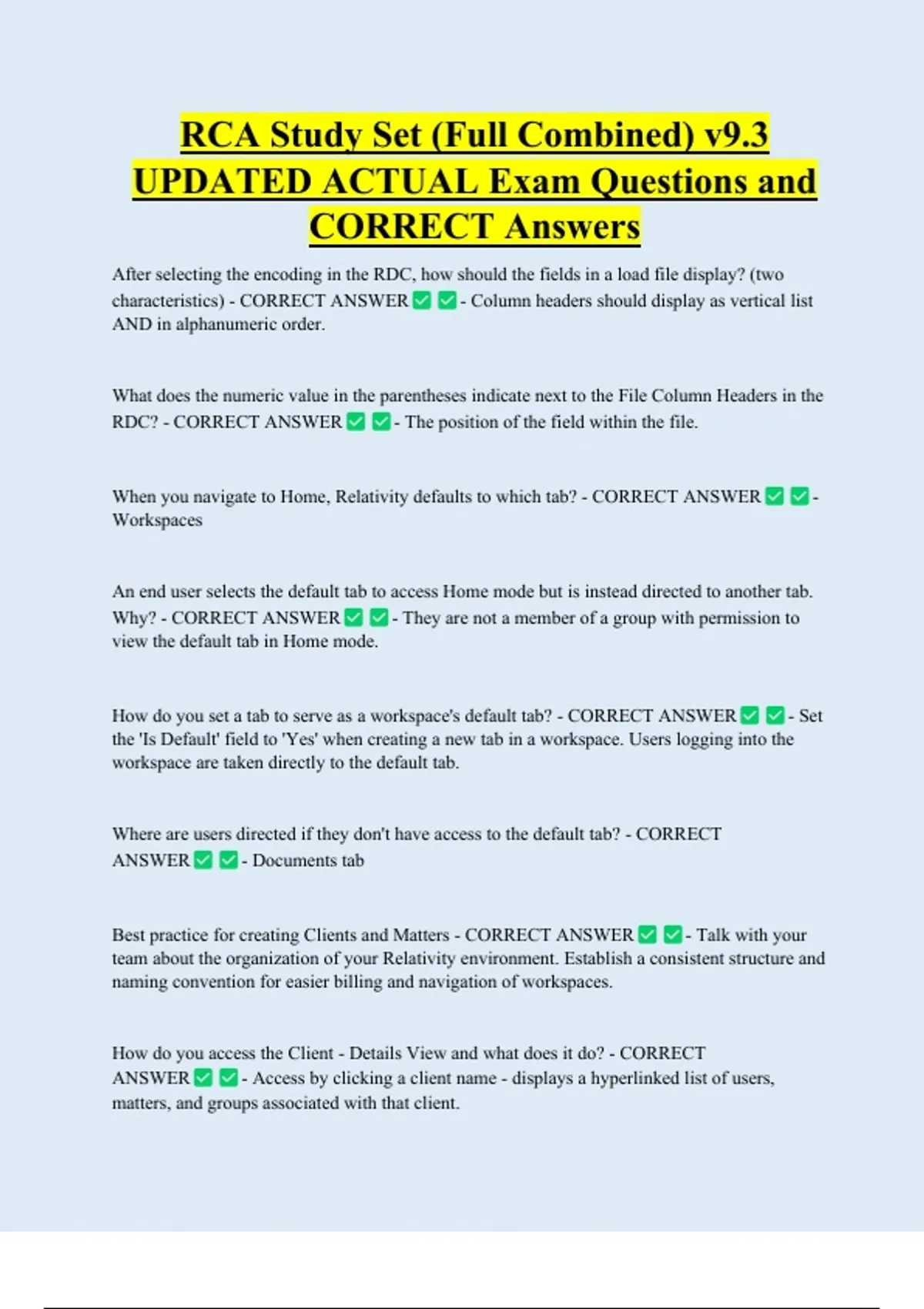 RCA Study Set (Full Combined) v9.3 UPDATED ACTUAL Exam Questions and CORRECT Answers After selecting the encoding in the RDC, how should the fields in a load file display? (two characteristics) - CORRECT ANSWER - Column headers should display as vertical list AND in alphanumeric order. What does the numeric value in the parentheses indicate next to the File Column Headers in the RDC? - CORRECT ANSWER - The position of the field within the file.