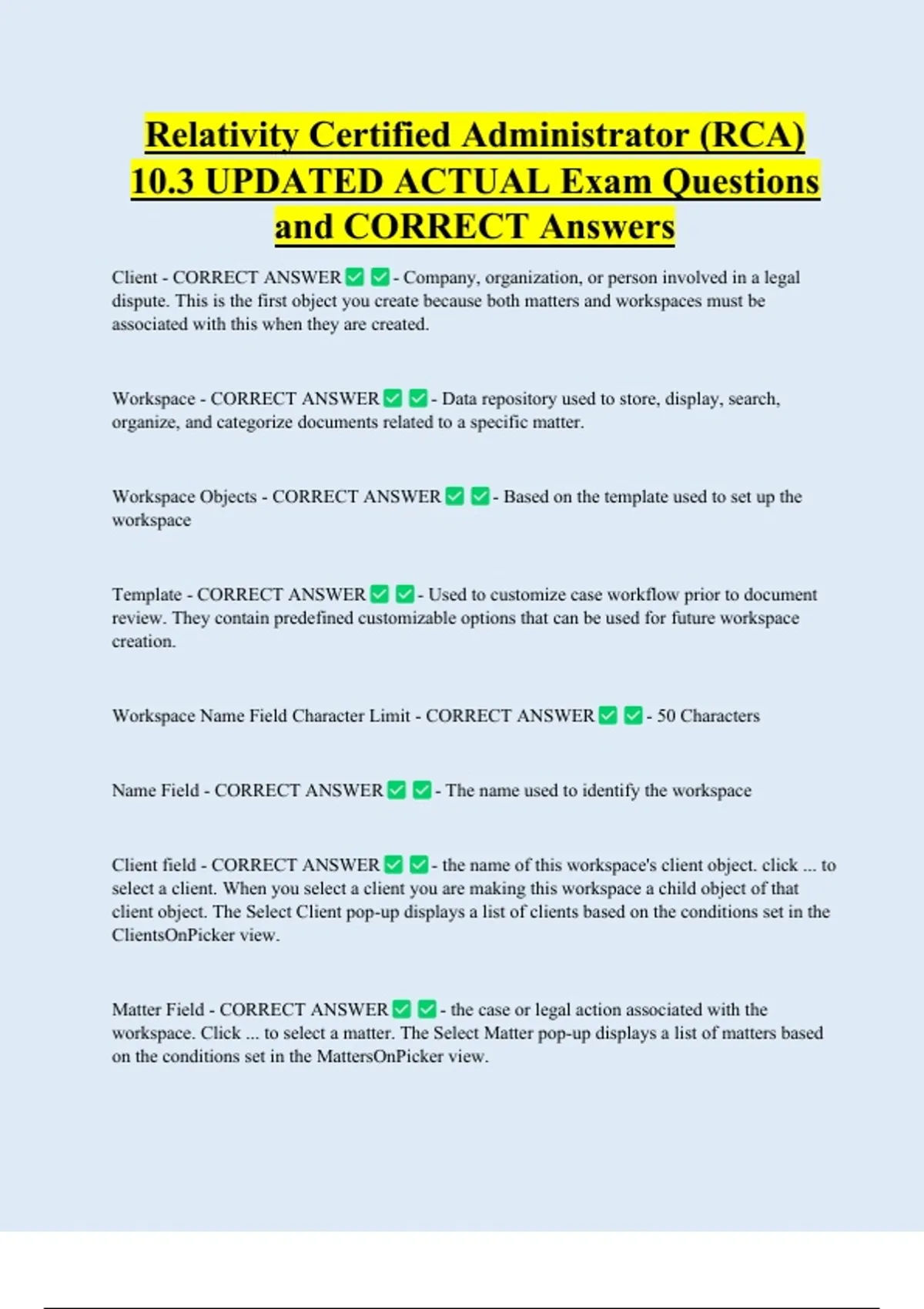 Relativity Certified Administrator (RCA) 10.3 UPDATED ACTUAL Exam Questions and CORRECT Answers Client - CORRECT ANSWER - Company, organization, or person involved in a legal dispute. This is the first object you create because both matters and workspaces must be associated with this when they are created. Workspace - CORRECT ANSWER - Data repository used to store, display, search, organize, and categorize documents related to a specific matter. Workspace Objects - CORRECT ANSWER workspace Template - CORRECT ANSWER - Based on the template used to set up the