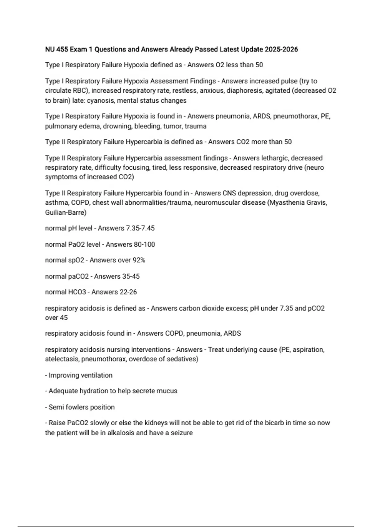 respiratory acidosis nursing interventions - Answers - Treat underlying cause (PE, aspiration,