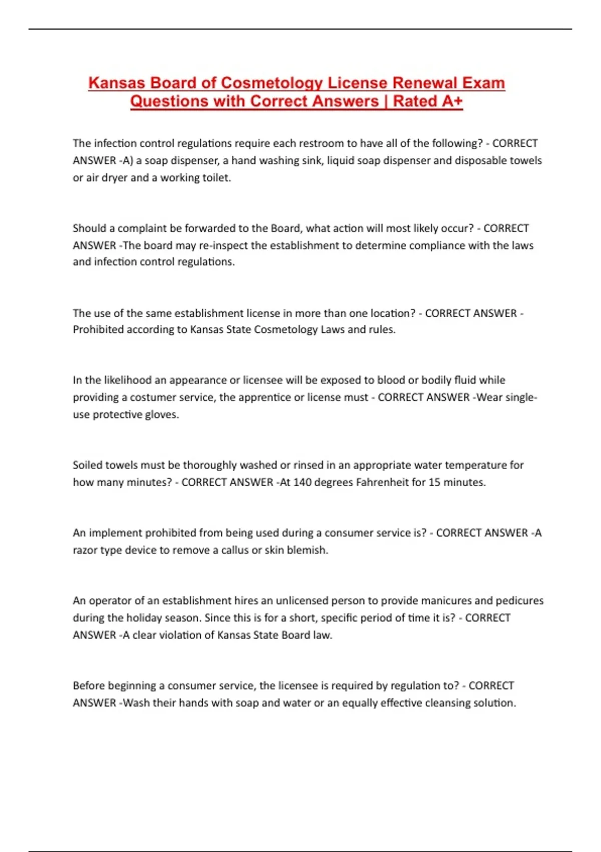Kansas Board of Cosmetology License Renewal Exam Questions with Correct Answers | Rated A+ | 2025/2026