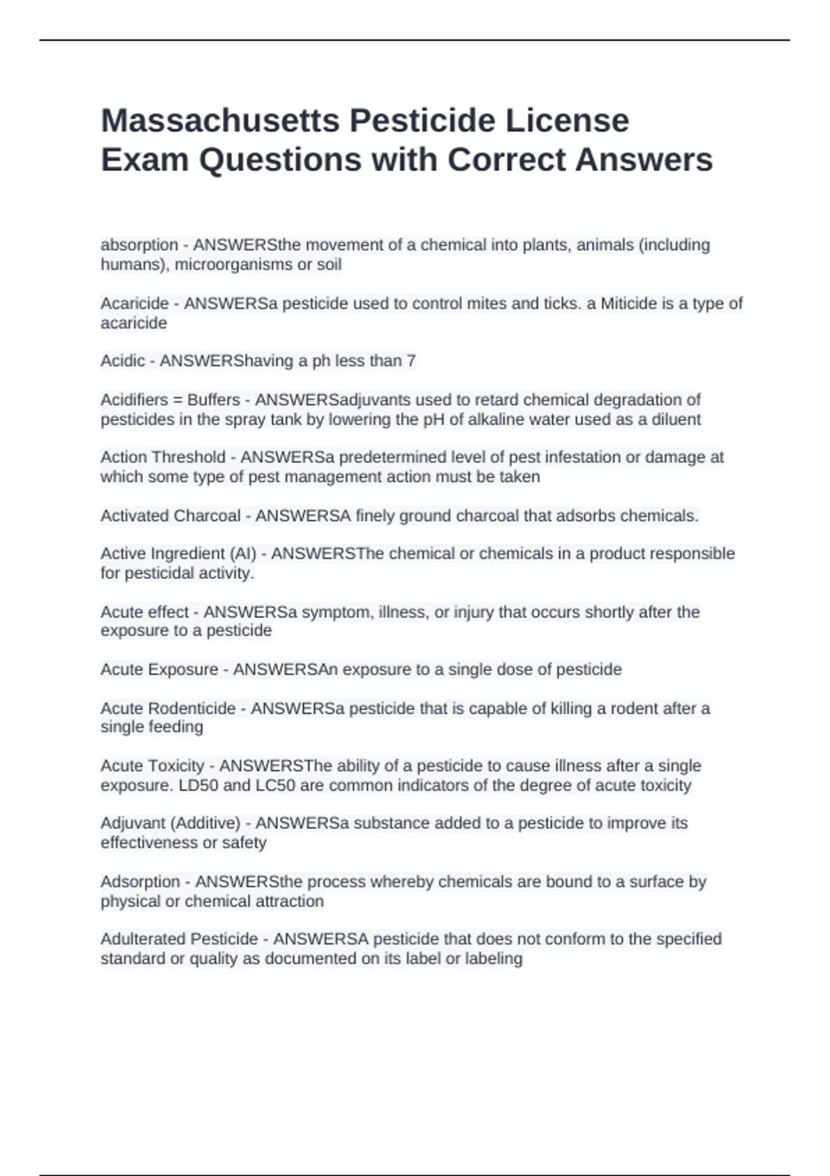 Massachusetts Pesticide License Exam Questions with Correct Answers