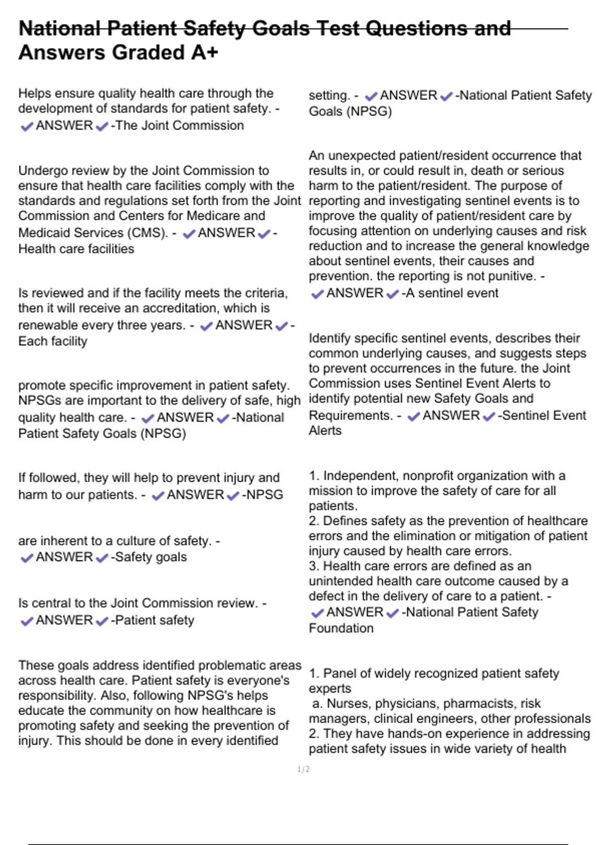 National Patient Safety Goals Test Questions and Answers Graded A+