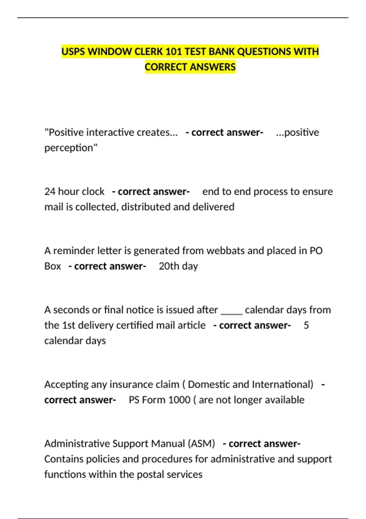 USPS WINDOW CLERK 101 TEST BANK QUESTIONS WITH