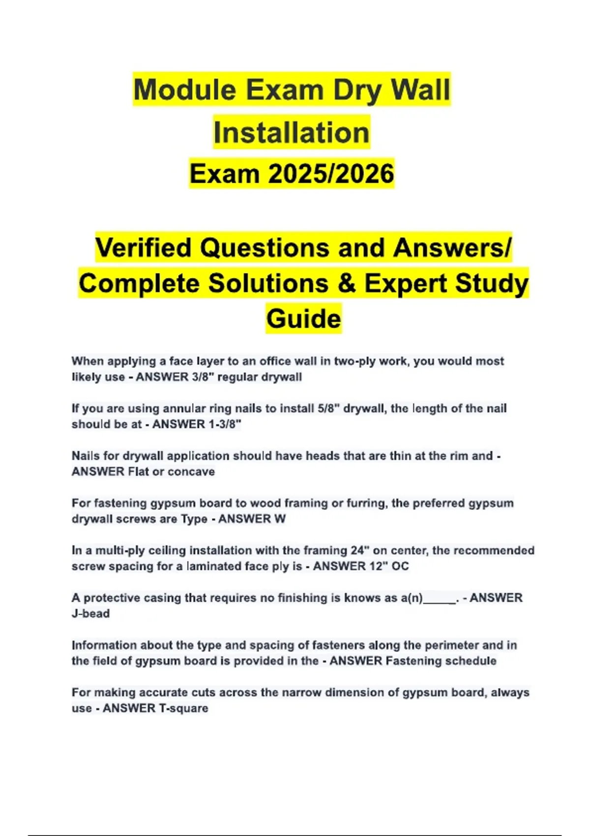 Prepare for the Drywall Installation Exam 2025/2026 with verified module questions, complete solutions, and a trusted study guide for A+ grade success.