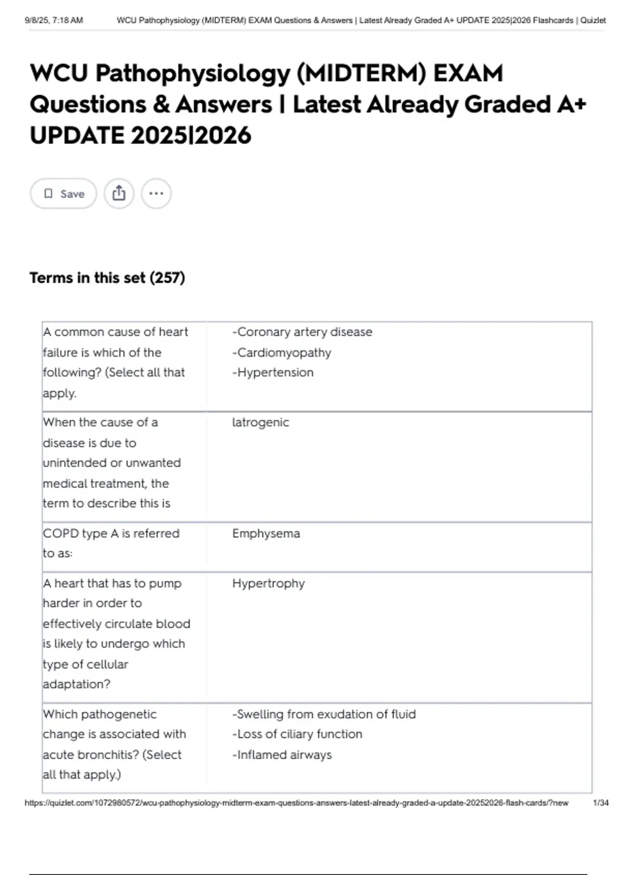 , 9/8/25, 7:18 AM WCU Pathophysiology (MIDTERM) EXAM Questions & Answers | Latest Already Graded A+ UPDATE 2025|2026 Flashcards | Quizlet