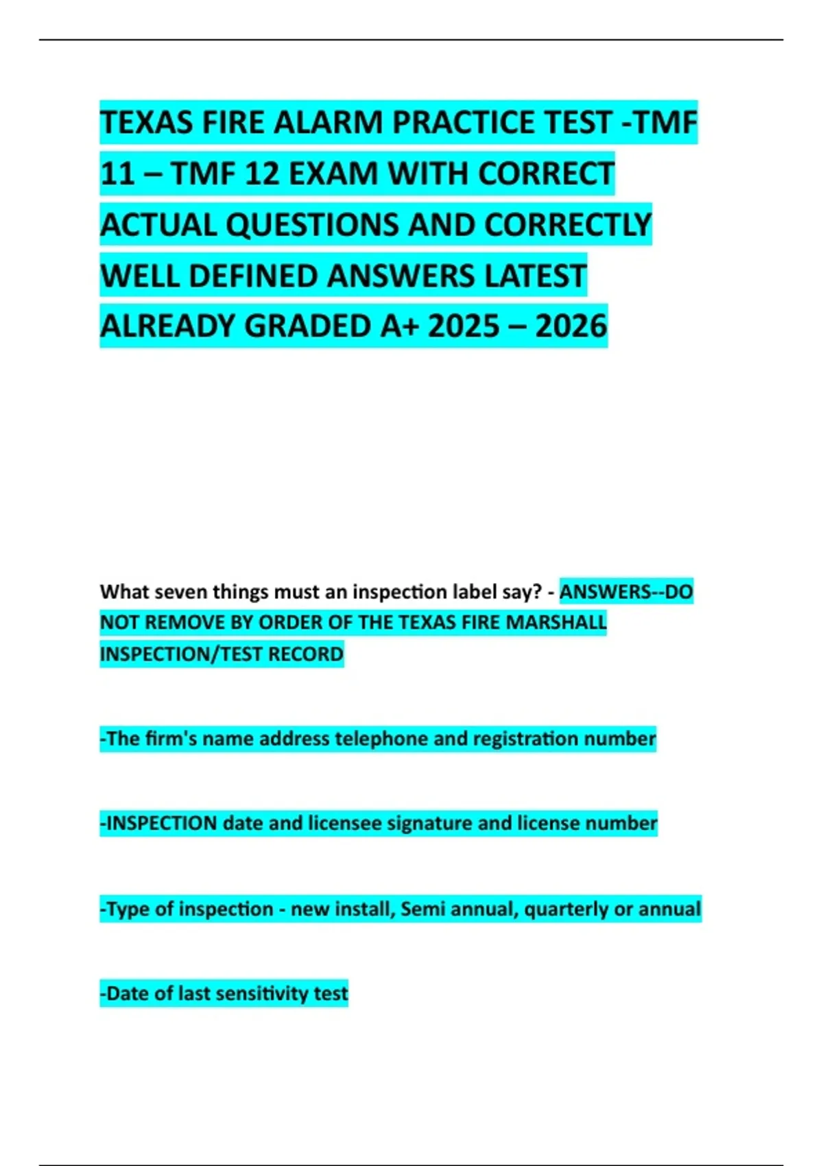 TEXAS FIRE ALARM PRACTICE TEST -TMF 11 – TMF 12 EXAM WITH CORRECT ACTUAL QUESTIONS AND CORRECTLY WELL DEFINED ANSWERS LATEST ALREADY GRADED A+ 2025 – 2026