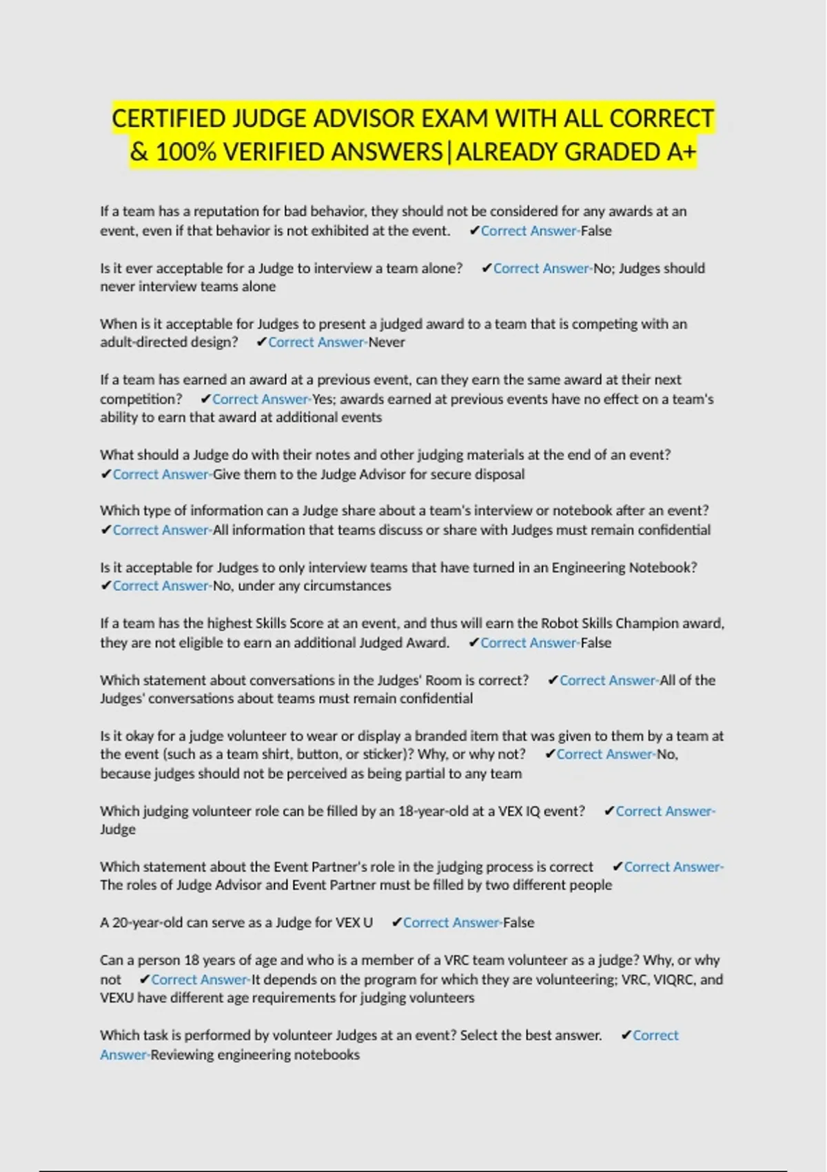 CERTIFIED JUDGE ADVISOR EXAM WITH ALL CORRECT