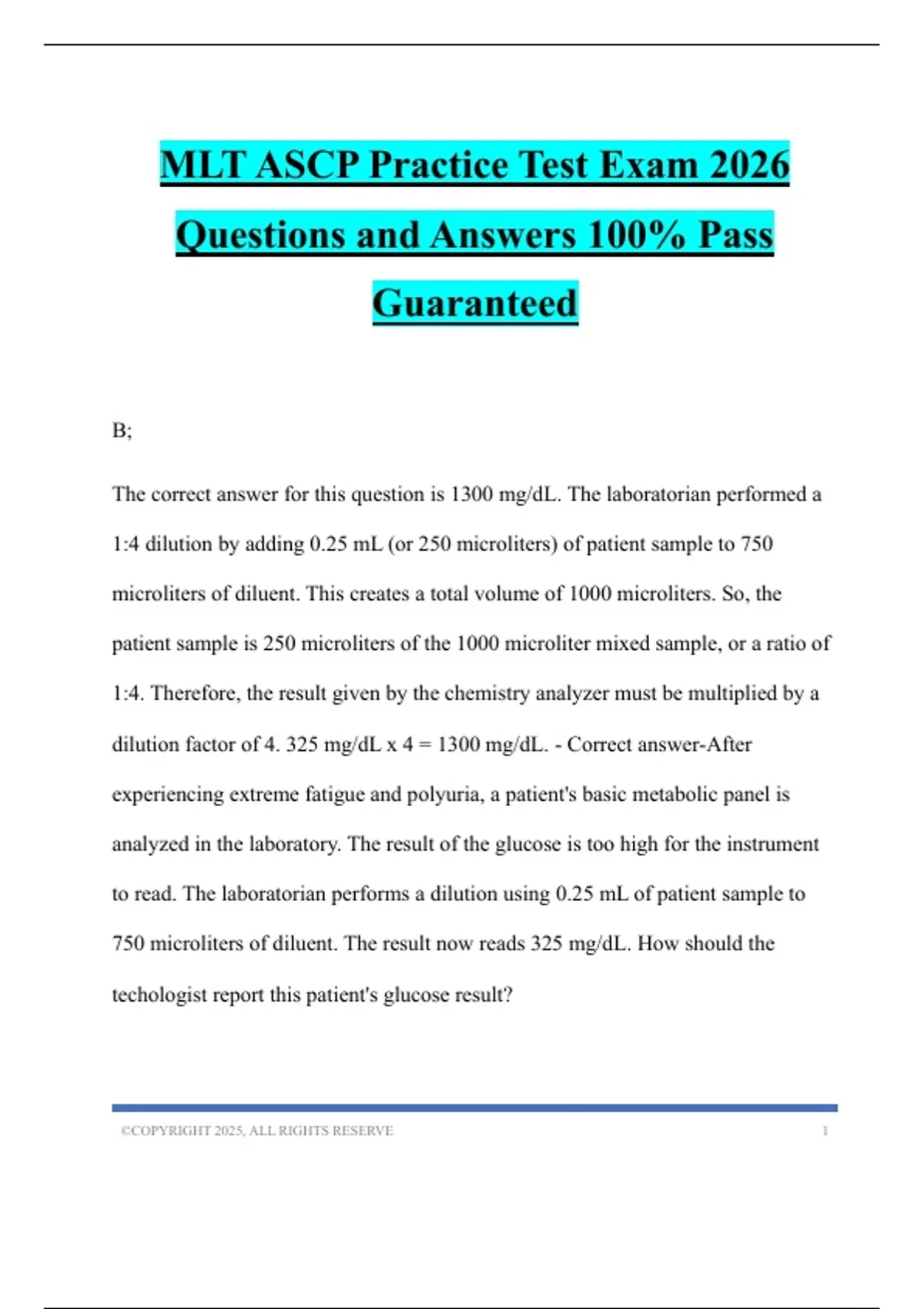 MLT ASCP Practice Test Exam 2026 Questions and Answers 100% Pass Guaranteed