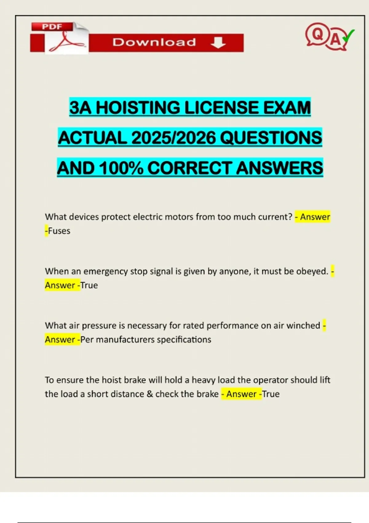 3A HOISTING LICENSE EXAM ACTUAL 2025/2026 QUESTIONS AND 100% CORRECT ANSWERS What devices protect electric motors from too much current? - Answer -Fuses When an emergency stop signal is given by anyone, it must be obeyed. - Answer -True What air pressure is necessary for rated performance on air winche