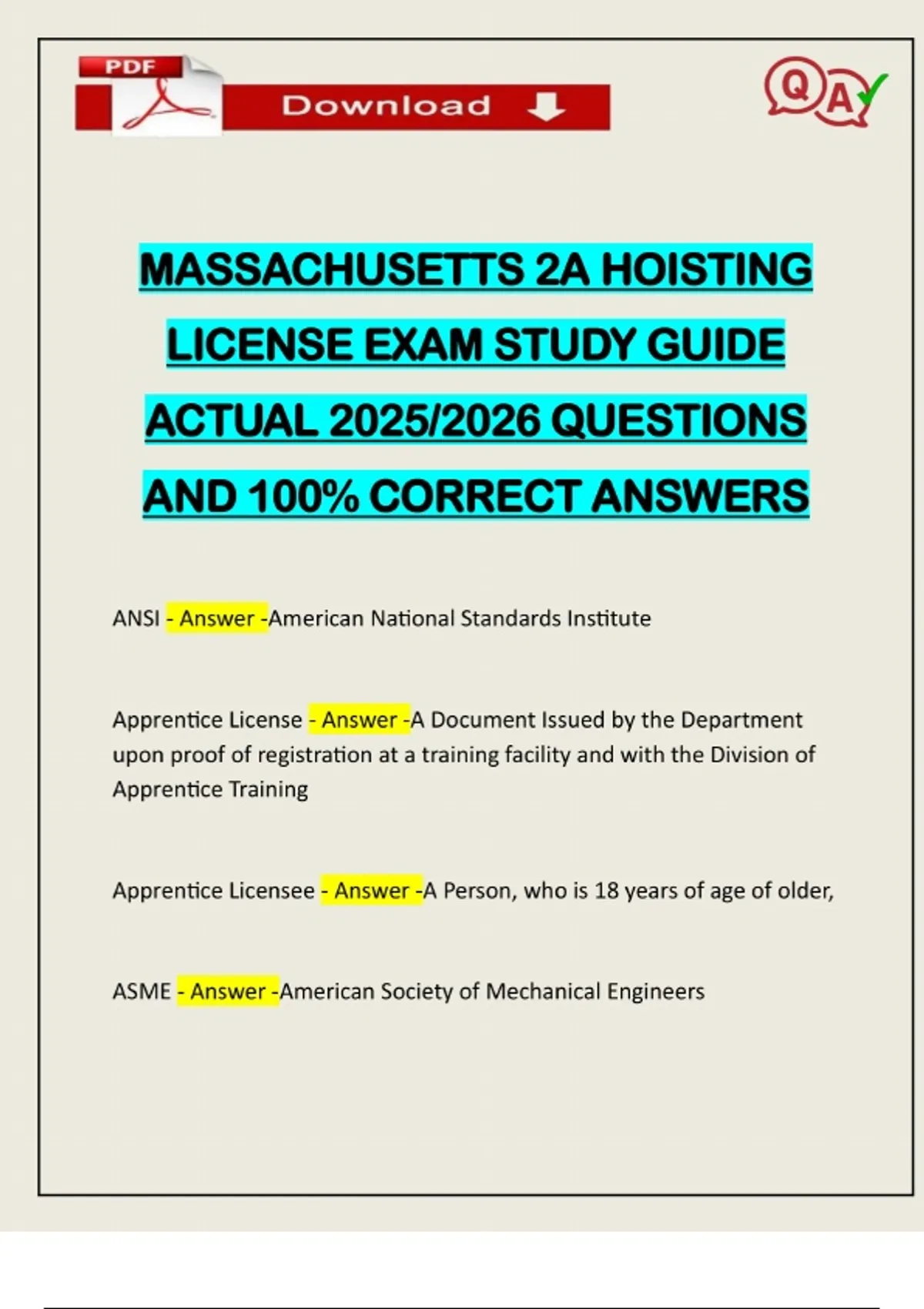 MASSACHUSETTS 2A HOISTING LICENSE EXAM STUDY GUIDE ACTUAL 2025/2026 QUESTIONS AND 100% CORRECT ANSWERS ANSI - Answer -American National Standards Institute Apprentice License - Answer -A Document Issued by the Department upon proof of registration at a training facility and with the Division of Apprentice Training Apprentice Licensee - Answer -A Person, who is 18 years of age of older, ASME - Answer -American Society of Mechanical EngineersNeed assistance on Online classes, Exams & Assignments? Reach out for instant help!! Full Course Assistance, Plagiarism-free Essay Writing, Research Paper, Dissertation, Discussion Posts, etc…. Confidential & Secure services. Tutors are available for all subjects! Email now at: Cargo - Answer -A Load, quantity, or volume that can be processed or transported Certificate of Completion - Answer -A Uniform certificate issued by a training facility to a licensee upon the satisfactory completion of a continuing education curriculum "Cheif" of Inspections - Answer -Mechanical of the Department o