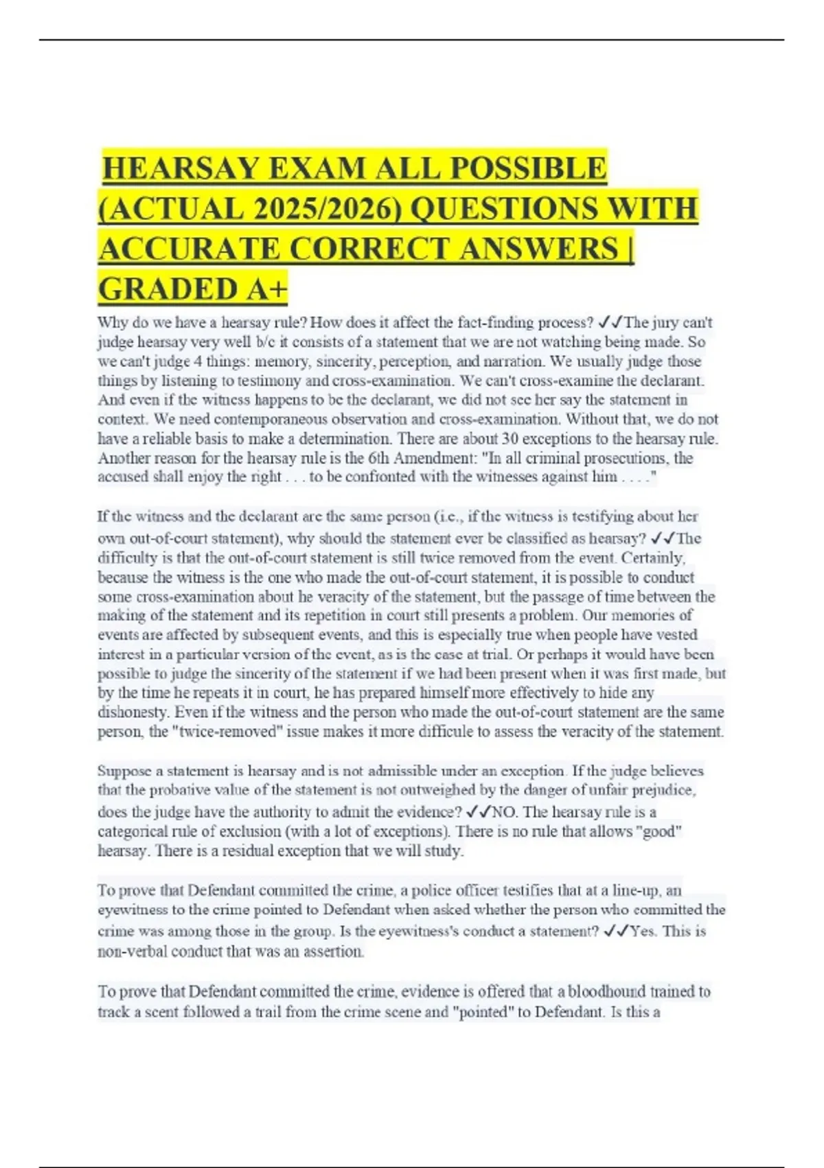 HEARSAY EXAM ALL POSSIBLE (ACTUAL 2025/2026) QUESTIONS WITH ACCURATE CORRECT ANSWERS | GRADED A+