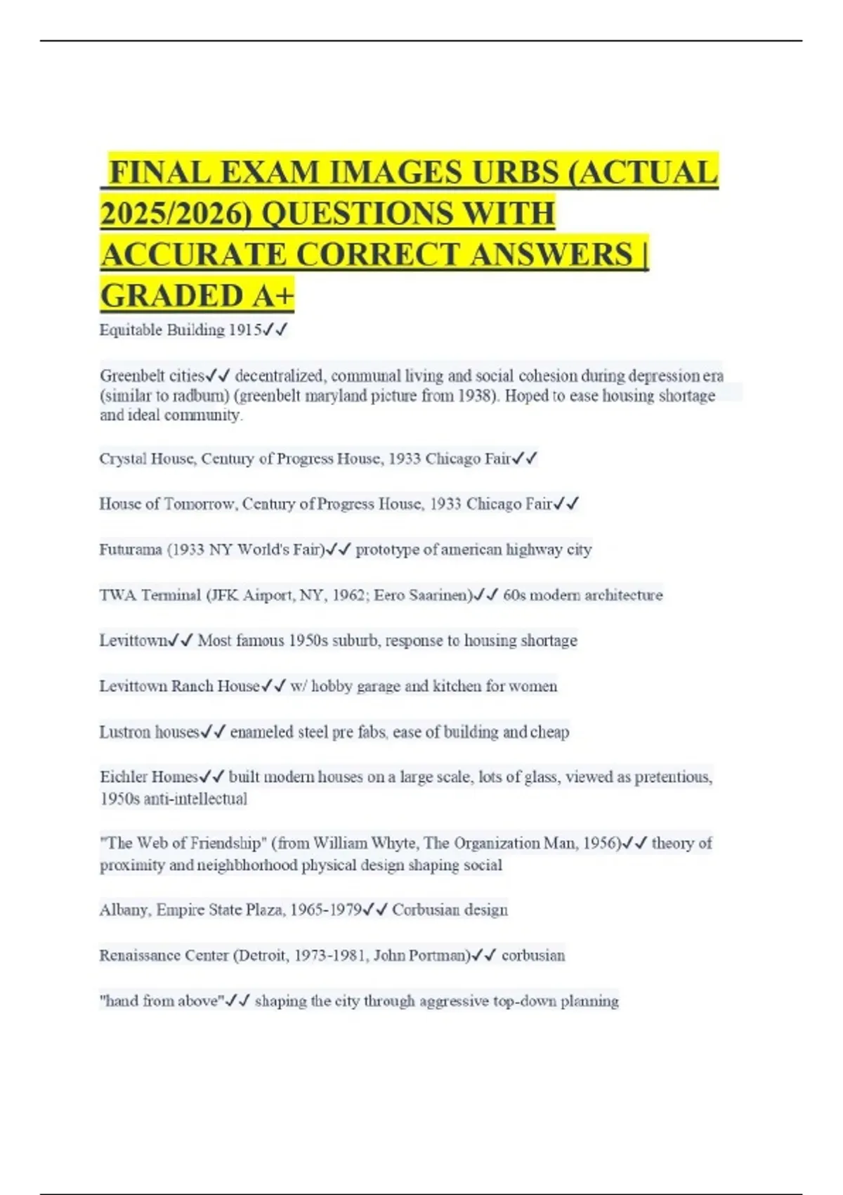 FINAL EXAM IMAGES URBS (ACTUAL 2025/2026) QUESTIONS WITH ACCURATE CORRECT ANSWERS | GRADED A+ Equitable Building 1915 Greenbelt cities decentralized, communal living and social cohesion during depression era (similar to radburn) (greenbelt maryland picture from 1938). Hoped to ease housing shortage and ideal community. Crystal House, Century of Progress House, 1933 Chicago Fair House of Tomorrow, Century of Progress House, 1933 Chicago Fair Futurama (1933 NY World's Fair) prototype of american highway city TWA Terminal (JFK Airport, NY, 1962; Eero Saarinen) 60s modern architecture Levittown Most famous 1950s suburb, response to housing shortage Levittown Ranch House w/ hobby garage and kitchen for women