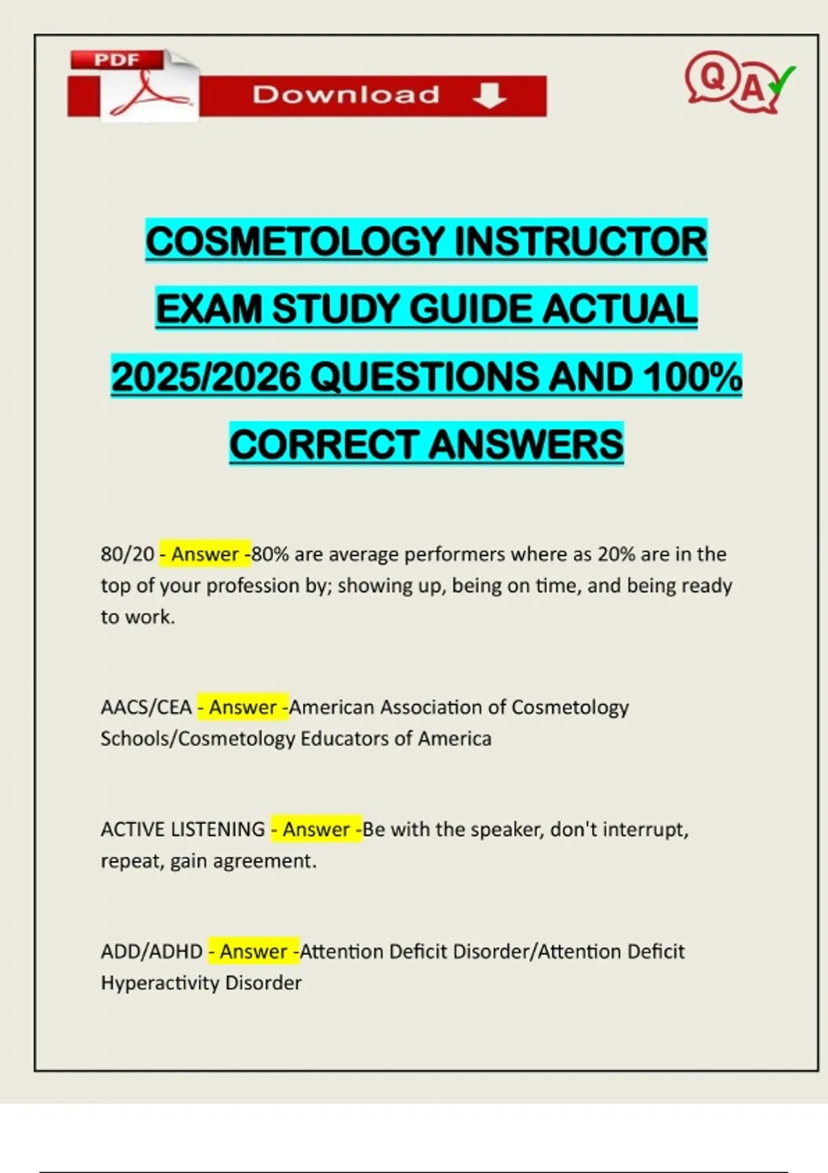 COSMETOLOGY INSTRUCTOR EXAM STUDY GUIDE ACTUAL 2025/2026 QUESTIONS AND 100% CORRECT ANSWERS 80/20 - Answer -80% are average performers where as 20% are in the top of your profession by; showing up, being on time, and being ready to work. AACS/CEA - Answer -American Association of Cosmetology Schools/Cosmetology Educators of America ACTIVE LISTENING - Answer -Be with the speaker, don't interrupt, repeat, gain agreement. ADD/ADHD - Answer -Attention Deficit Disorder/Attention Deficit Hyperactivity DisorderNeed assistance on Online classes, Exams & Assignments? Reach out for instant help!! Full Course Assistance, Plagiarism-free Essay Writing, Research Paper, Dissertation, Discussion Posts, etc…. Confidential & Secure services. Tutors are available for all subjects! Email now at: ADVISORY COUNCIL - Answer -Composed of school owners and directors, educators and employers, graduates, representatives from state, regulatory oversight agencies. Identifies and prioritizes subject matter and skills that need to be taught. ANECDOTES - Answer -Describes a specific point to help get the learner