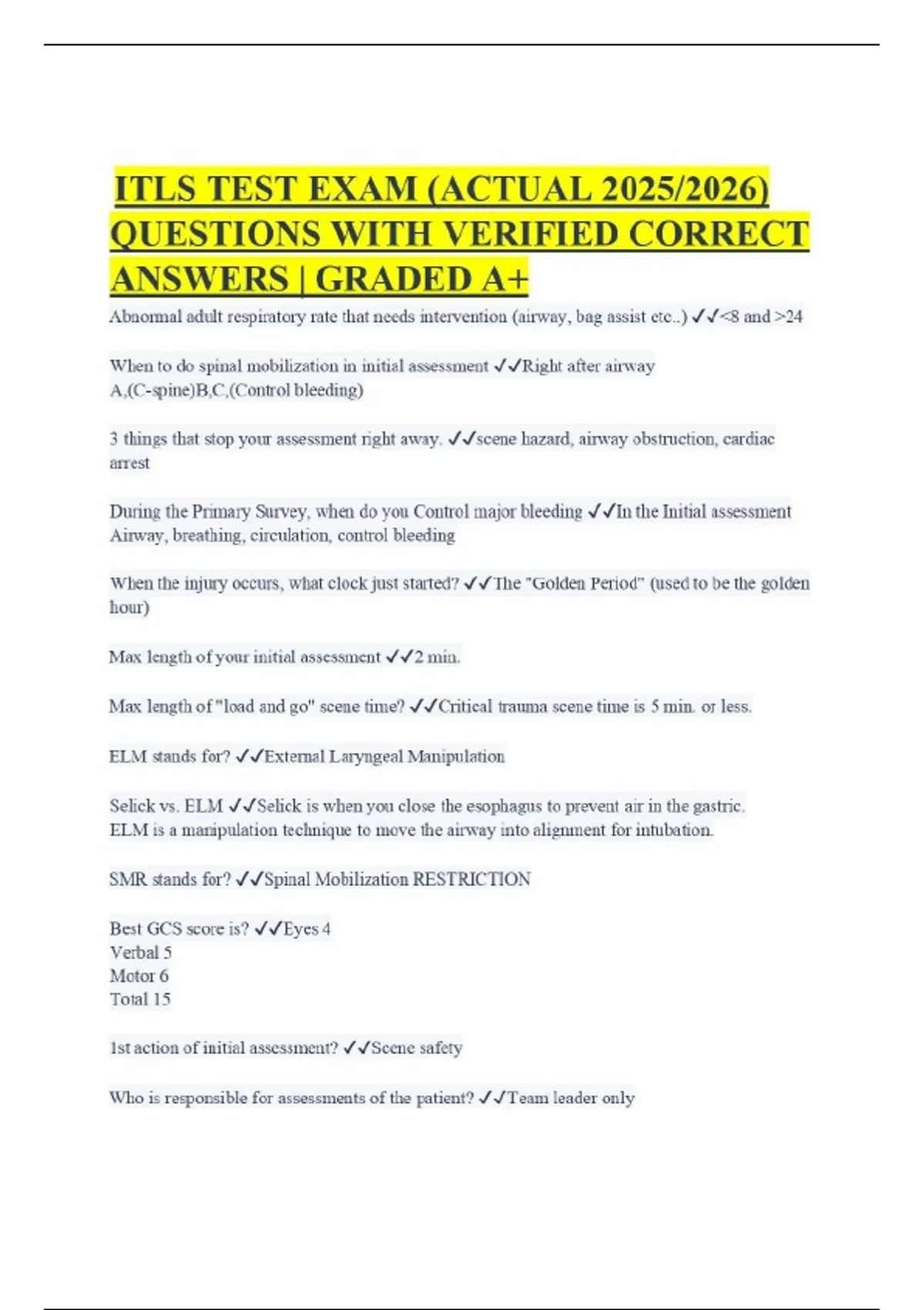 ITLS TEST EXAM (ACTUAL 2025/2026) QUESTIONS WITH VERIFIED CORRECT ANSWERS | GRADED A+