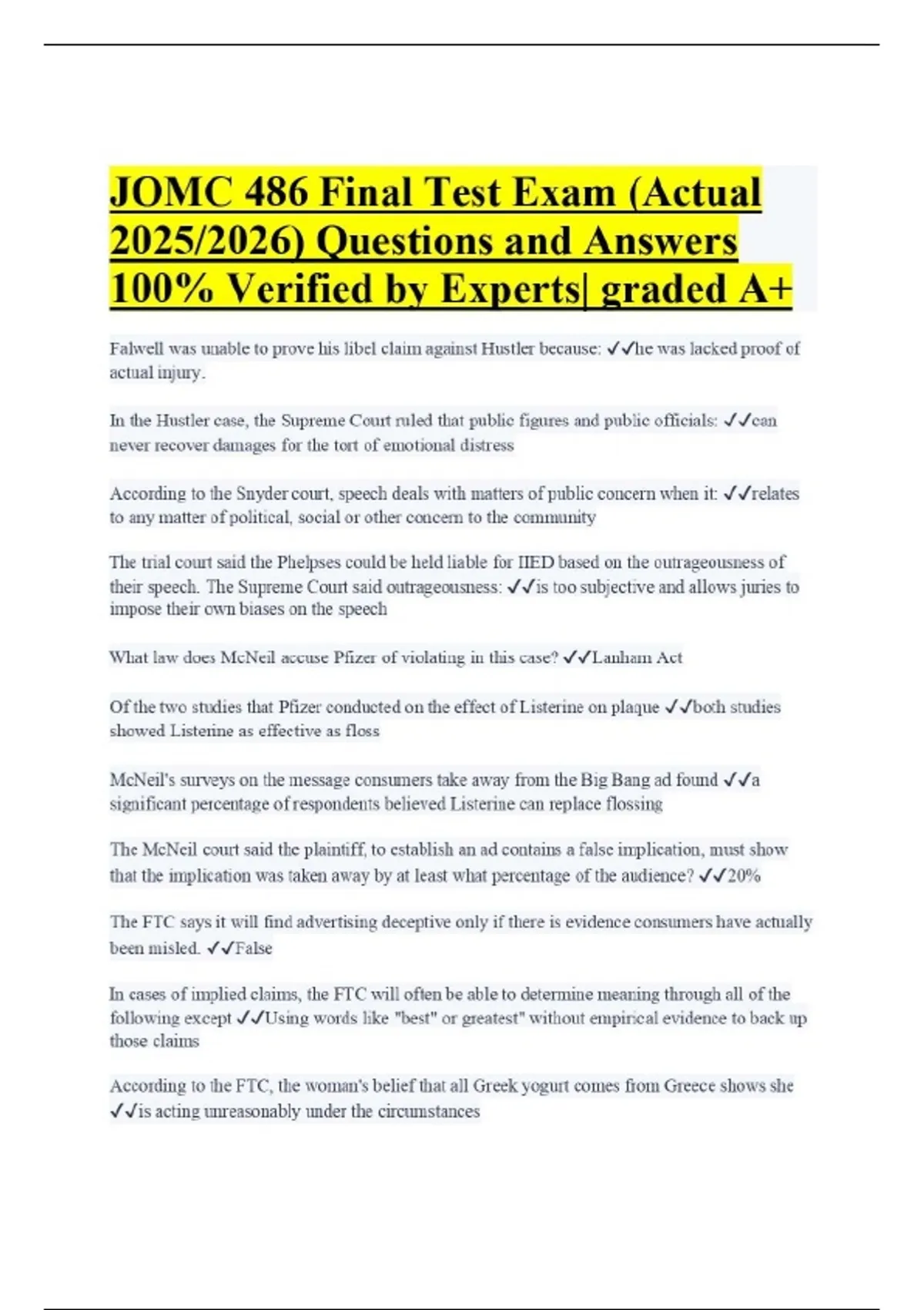 JOMC 486 Final Test Exam (Actual 2025/2026) Questions and Answers 100% Verified by Experts| graded A+ Falwell was unable to prove his libel claim against Hustler because: he was lacked proof of actual injury. In the Hustler case, the Supreme Court ruled that public figures and public officials: can never recover damages for the tort of emotional distress According to the Snyder court, speech deals with matters of public concern when it: relates to any matter of political, social or other concern to the community The trial court said the Phelpses could be held liable for IIED based on the outrageousness of their speech. The Supreme Court said outrageousness: is too subjective and allows juries to impose their own biases on the speech What law does McNeil accuse Pfizer of violating in this case? Lanham Act Of the two studies that Pfizer conducted on the effect of Listerine on plaque both studies showed Listerine as effective as floss