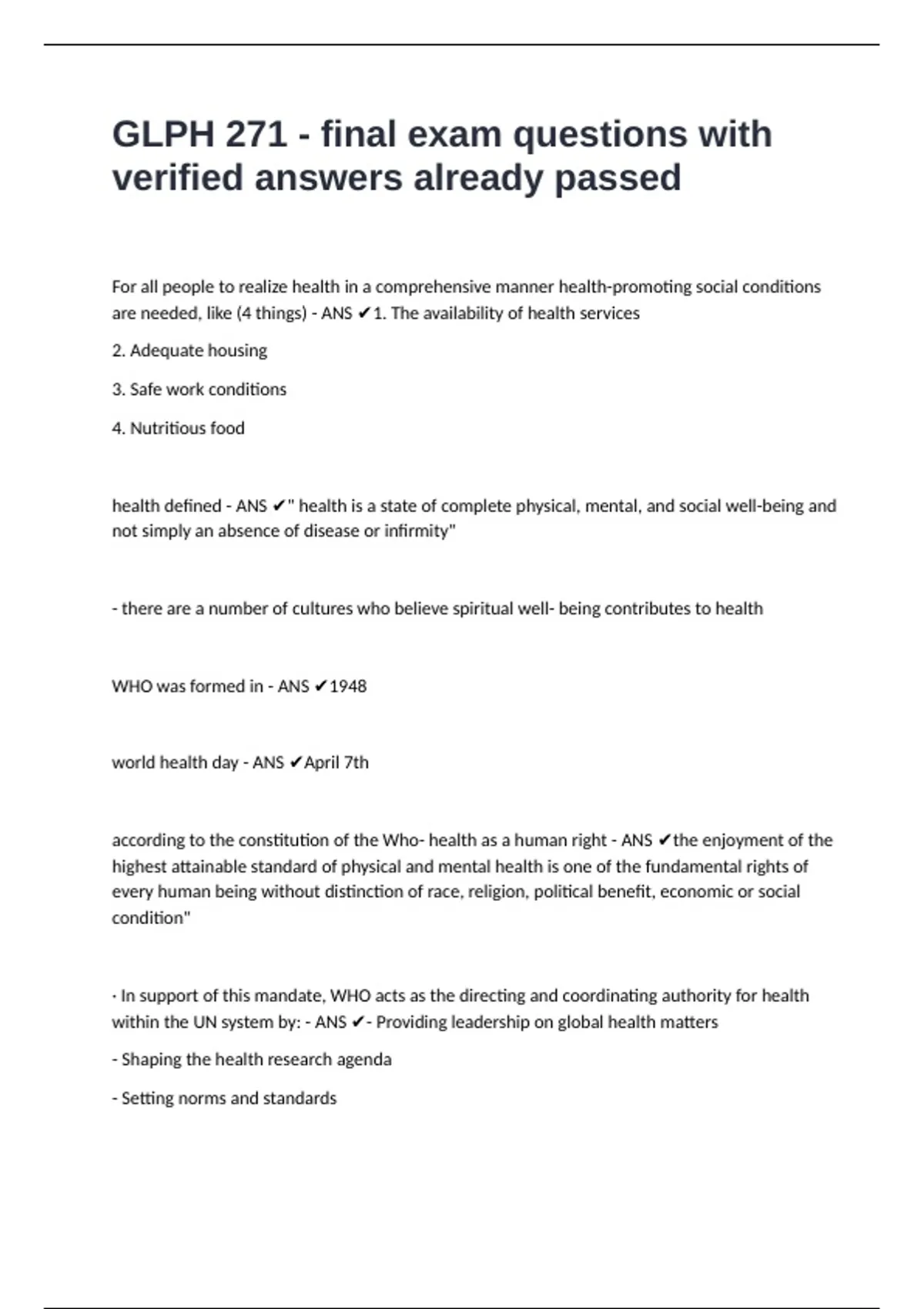 GLPH 271 - final exam questions with verified answers already passedFor all people to realize health in a comprehensive manner health-promoting social conditions are needed, like (4 things) - ANS 1. The availability of health services 2. Adequate housing 3. Safe work conditions 4. Nutritious food health defined - ANS " health is a state of complete physical, mental, and social well-being and not simply an absence of disease or infirmity" - there are a number of cultures who believe spiritual well- being contributes to health WHO was formed in - ANS 1948 world health day - ANS April 7th according to the constitution of the Who- health as a human right - ANS the enjoyment of the highest attainable standard of physical and mental health is one of the fundamental rights of every human being without distinction of race, religion, political benefit, economic or social condition" · In support of this mandate, WHO acts as the directing and coordinating authority for health within the UN system by: - ANS - Providing leadership on global health matters - Shaping the health research agenda