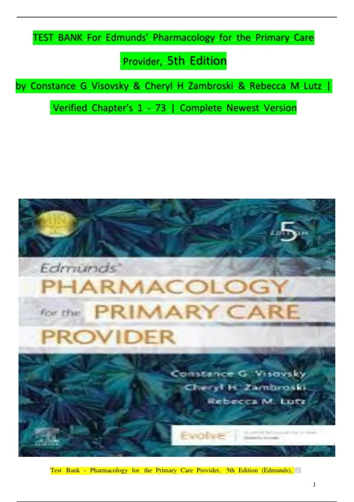 TEST BANK For Edmunds' Pharmacology for the Primary Care Provider, 5th Edition by Constance G Visovsky 9780323661171 Chapters 1-73 Complete Guide.