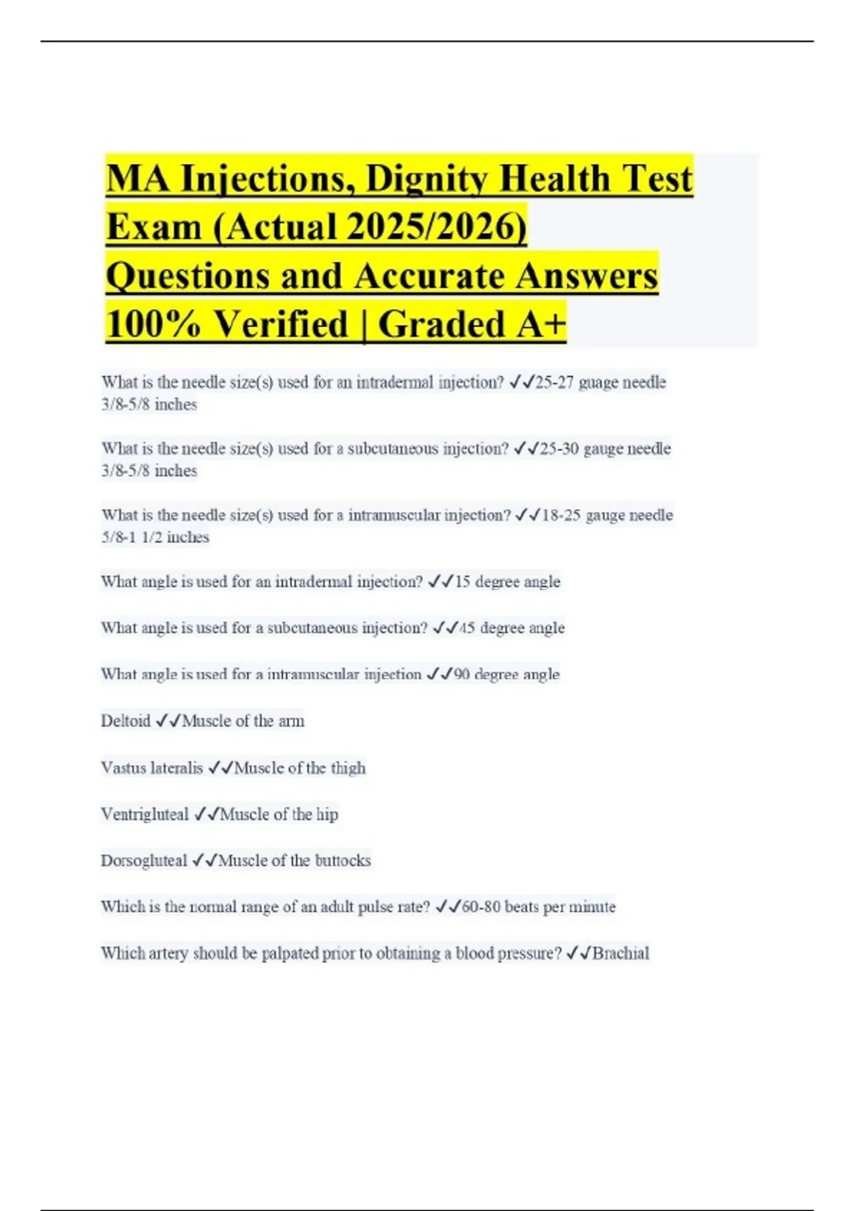 MA Injections, Dignity Health Test Exam (Actual 2025/2026) Questions and Accurate Answers 100% Verified | Graded A+