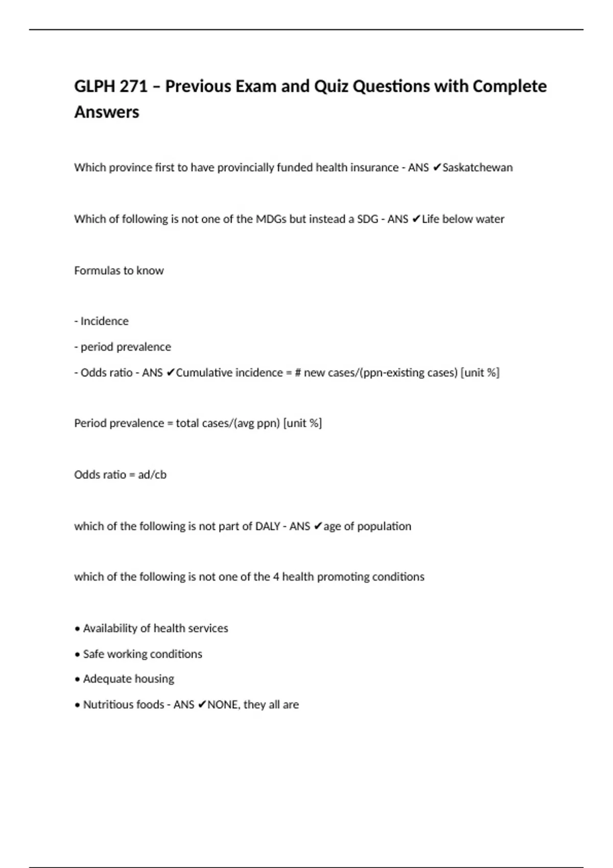 GLPH 271 – Previous Exam and Quiz Questions with Complete Answers