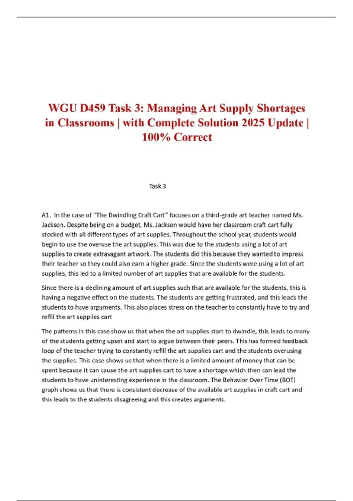 WGU D459 Task 3: Managing Art Supply Shortages in Classrooms | with Complete Solution 2025 Update | 100% Correct