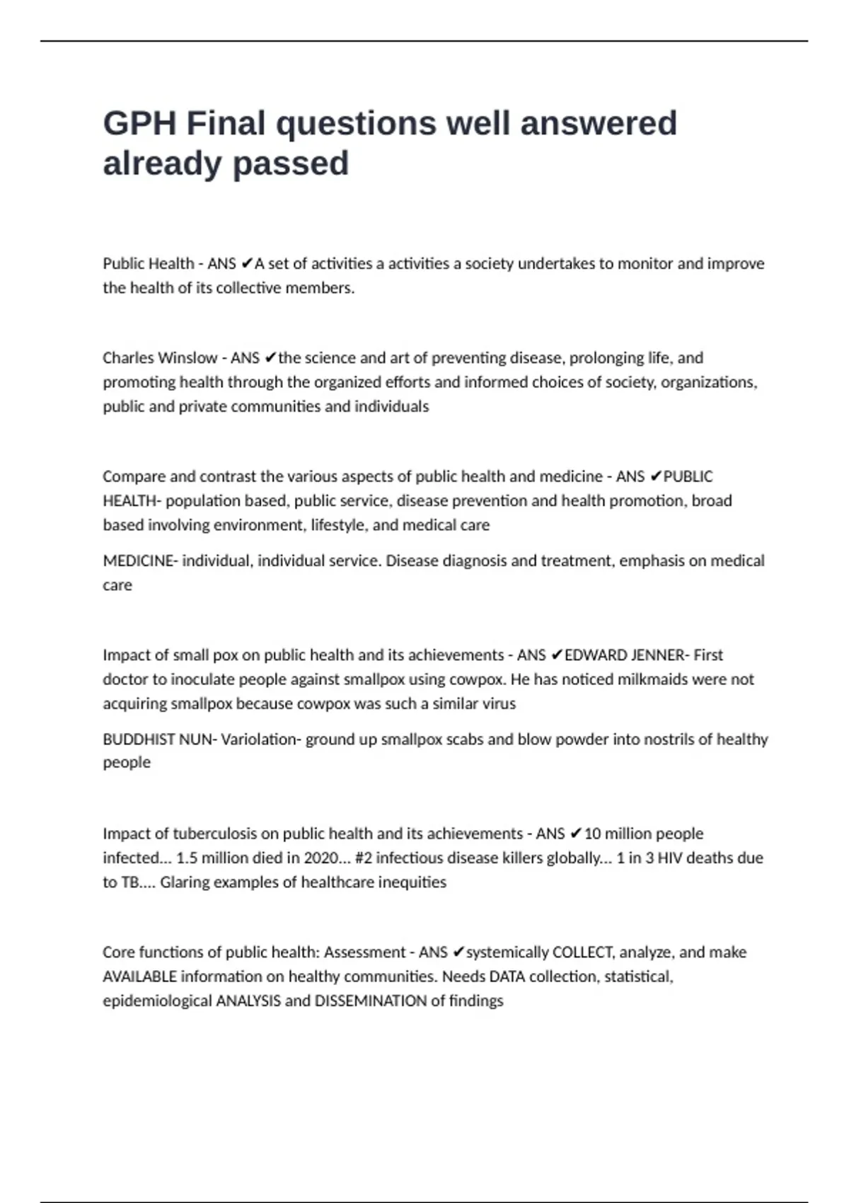 Core functions of public health: Assurance - ANS ✔Ensure PROVISION of services to those in