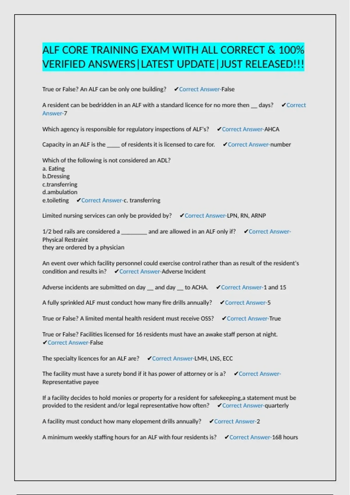 Which agency is responsible for regulatory inspections of ALF's? ✔Correct Answer-AHCA