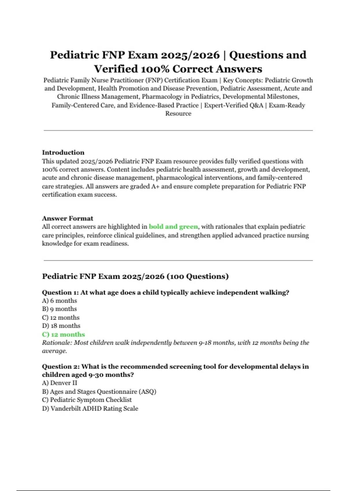 This updated 2025/2026 Pediatric FNP Exam resource provides fully verified questions with