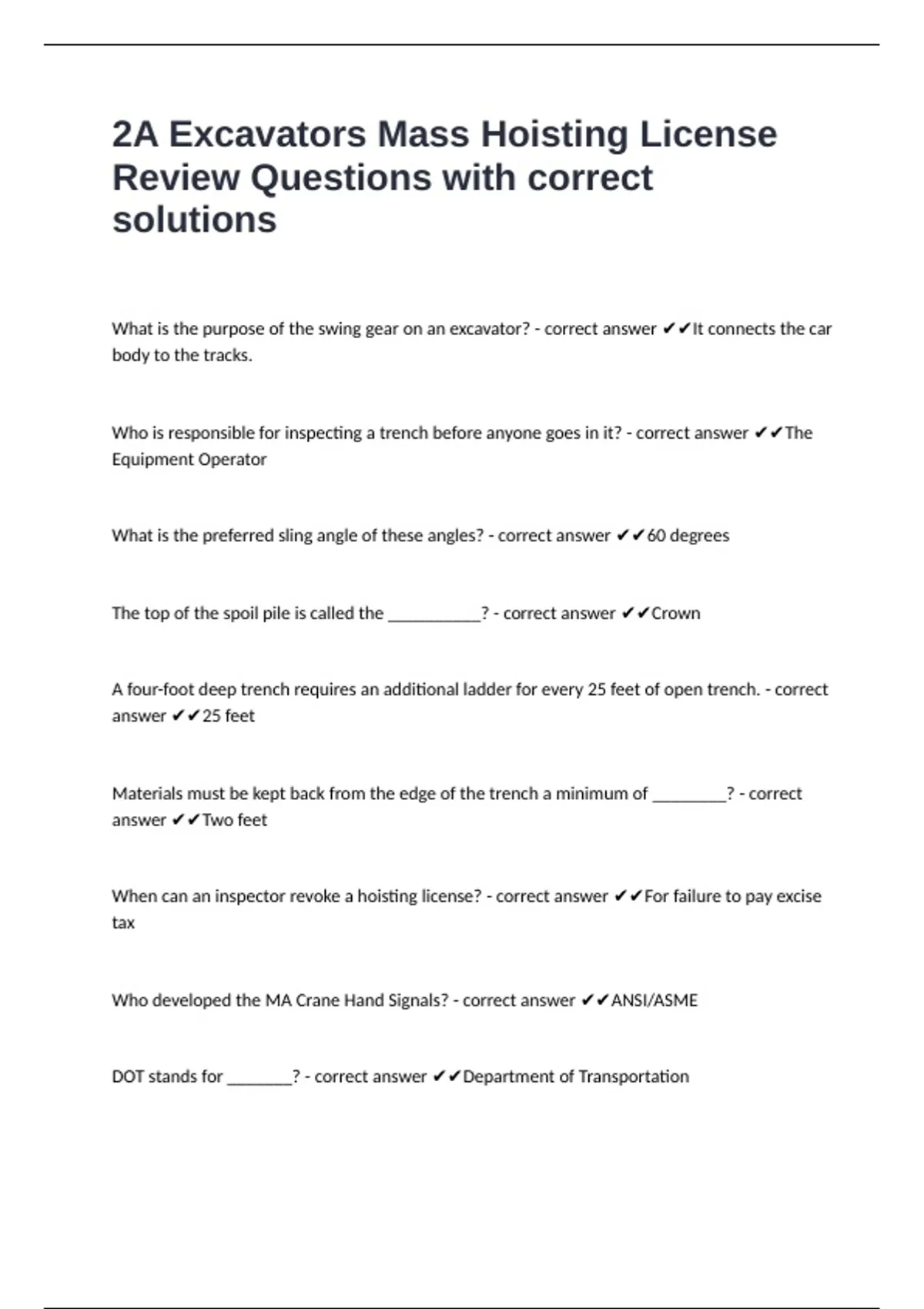2A Excavators Mass Hoisting License Review Questions with correct solutions