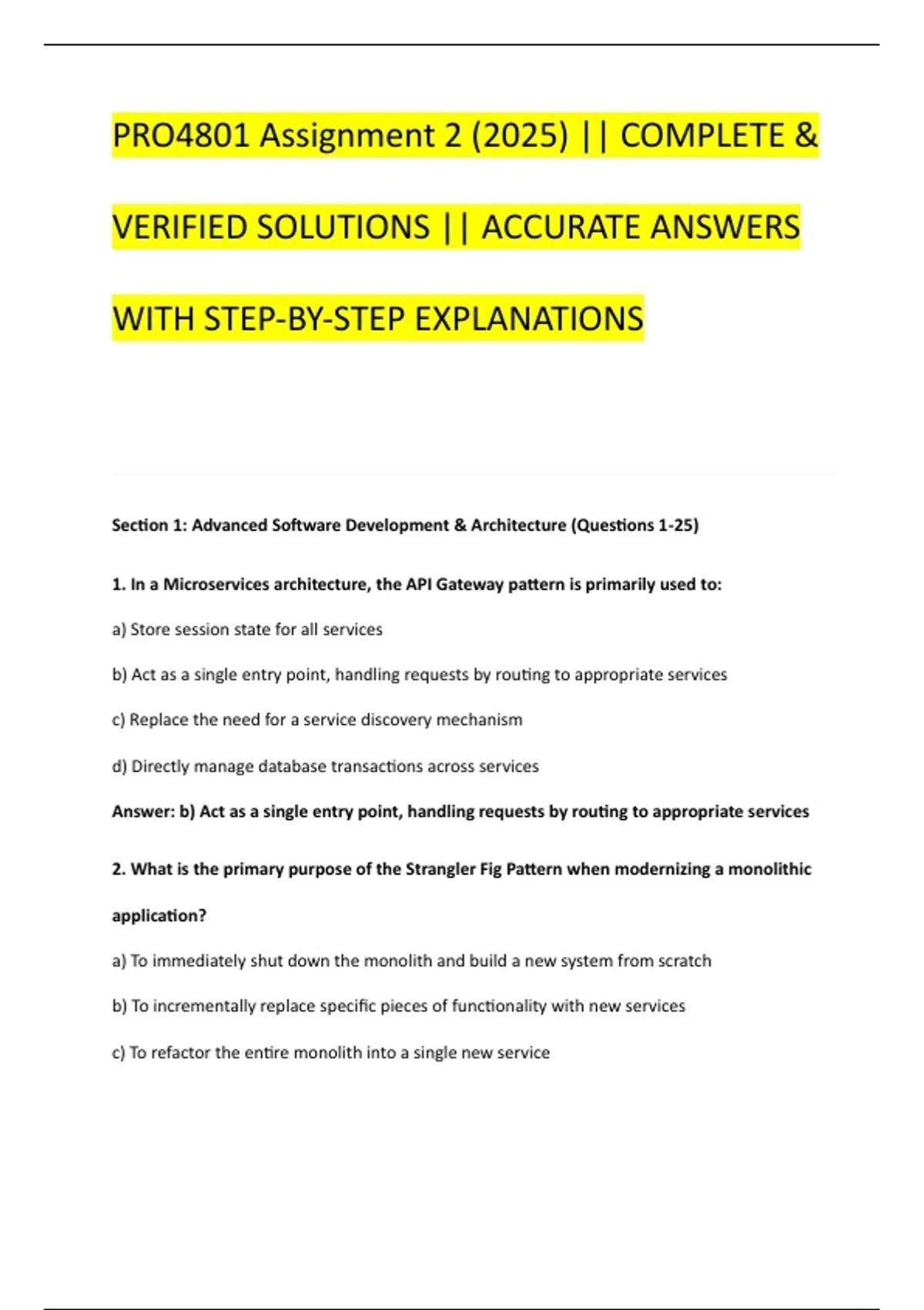 PRO4801 Assignment 2 (2025) || COMPLETE & VERIFIED SOLUTIONS || ACCURATE ANSWERS WITH STEP-BY-STEP EXPLANATIONS Section 1: Advanced Software Development & Architecture (Questions 1-25) 1. In a Microservices architecture, the API Gateway pattern is primarily used to: a) Store session state for all services b) Act as a single entry point, handling requests by routing to appropriate services c) Replace the need for a service discovery mechanism d) Directly manage database transactions across services Answer: b) Act as a single entry point, handling requests by routing to appropriate services 2. What is the primary purpose of the Strangler Fig Pattern when modernizing a monolithic application? a) To immediately shut down the monolith and build a new system from scratch b) To incrementally replace specific pieces of functionality with new services c) To refactor the entire monolith into a single new service d) To add a new user interface on top of the existing monolith without changing the backend Answer: b) To incrementally replace specific pieces of functionality with new services 3. In Domain-Driven Design (DDD), a "Bounded Context" is best defined as: a) The total scope of the software system b) A specific responsibility within the system with explicit boundaries c) The database schema for a particular module d) The user interface for a core domain Answer: b) A specific responsibility within the system with explicit boundaries 4. Which characteristic is MOST critical for a service to be considered "cloud-native"? a) It is written in a specific programming language like Go or Rust. b) It is packaged and deployed using containers (e.g., Docker). c) It relies on a specific cloud vendor's proprietary services. d) It uses an expensive enterprise application server. Answer: b) It is packaged and deployed using containers (e.g., Docker). 5. The "Sidecar" pattern in a service mesh like Istio is used to: a) Provide a backup service in case the main service fails b) Decouple auxiliary functionalities (like logging, monitoring) from the main application c) Store session data for the main application container d) Act as the primary database connection pool Answer: b) Decouple auxiliary functionalities (like logging, monitoring) from the main application 6. Event Sourcing as an architectural pattern involves: a) Storing only the current state of an entity in the database b) Storing a sequence of state-changing events as the system of record c) Using message queues for all database writes d) Logging all user actions to a security audit trail Answer: b) Storing a sequence of state-changing events as the system of record 7. A canary release is a deployment strategy used to: a) Deploy a new version to all users simultaneously b) Roll back a deployment automatically if errors are detected c) Deploy a new version to a small subset of users before a full rollout d) Deploy two identical versions for load balancing purposes