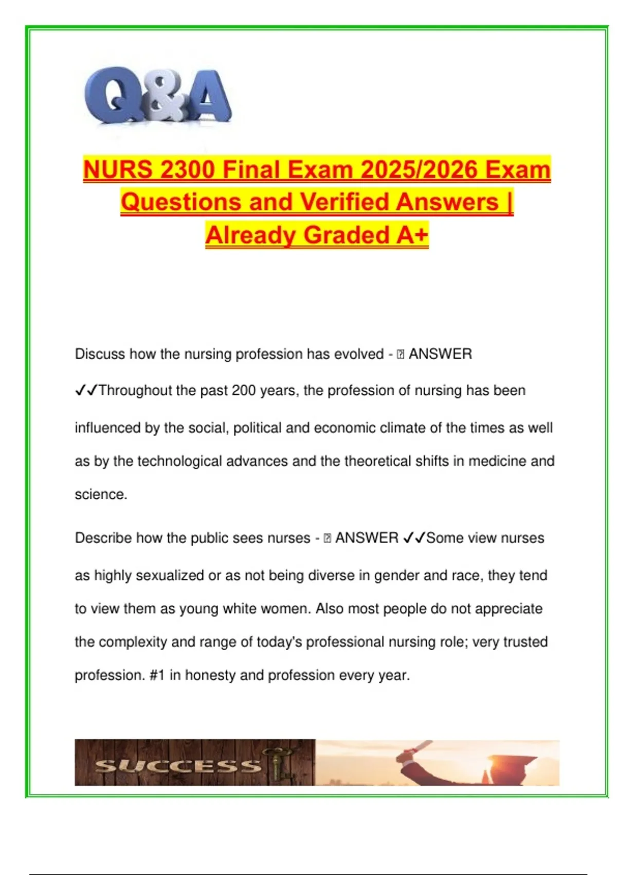 This NURS 2300 Final Exam 2025/2026 review guide contains over 250 professionally verified questions and answers, specifically tailored to align with the final exam curriculum for professional nursing foundations. Structured in an easy-to-study Q&A format, the guide offers comprehensive coverage of the core concepts necessary for success in nursing education, professional readiness, and NCLEX preparation. Whether you're a first-year BSN student or nearing graduation, this document supports your deep understanding of the profession’s responsibilities, evolution, ethics, and legal frameworks. Key concepts covered include: History and Evolution of Nursing Florence Nightingale, Mary Mahoney, Clara Barton, Lillian Wald, and other pioneers Development of professional nursing roles and responsibilities Social, political, and demographic influences on the nursing profession Nursing as a Profession Definitions and distinctions between occupation and profession Characteristics of professional nursing practice ANA’s Code of Ethics and UTA Nursing Student Code of Ethics Social perception and media representation of nurses Nursing Education and Licensure Pathways to RN: Diploma, ADN, BSN LPN vs. RN roles and scope Certification vs. licensure differences State Boards of Nursing authority and licensure discipline Critical Thinking and Clinical Judgment Steps of the nursing process Characteristics of critical thinkers Novice vs. expert thinking (Benner’s model) Application of nursing theory to clinical decision-making Legal and Ethical Responsibilities Elements of malpractice and negligence Informed consent, confidentiality, and patient advocacy Delegation and nursing accountability HIPAA regulations and social media boundaries Ethical theories: Deontology, Utilitarianism, Virtue Ethics, Principlism Ethical principles: Autonomy, Beneficence, Nonmaleficence, Fidelity, Veracity, Justice Research and Evidence-Based Practice (EBP) Steps of the research process Barriers and facilitators to EBP implementation Nurse scientist roles and relationship between theory, research, and practice Professional Socialization & Self-Care Role transitions from student to professional nurse Compassion fatigue, burnout, and strategies for self-care Incivility and disruptive behavior in academic and clinical environments Impact of work culture and generational differences Therapeutic Communication & Cultural Competence Differences between professional and social relationships Techniques for effective therapeutic communication Cultural beliefs and patient care considerations Behaviors that demonstrate cultural sensitivity This guide provides holistic preparation for final exams, licensure readiness, and personal growth within the nursing profession. Each answer is grounded in current academic standards and ethical practice expectations. Relevant for: Courses: NURS 2300, Introduction to Professional Nursing, Nursing Ethics, Foundations of Nursing Practice Students: BSN, ADN, accelerated nursing programs, LPN-to-RN bridge students, NCLEX-RN prep students Keywords: nursing history, nursing ethics, professional values, critical thinking in nursing, nursing licensure, nurse theorists, nursing education pathways, malpractice, informed consent, HIPAA, delegation, code of ethics, evidence based practice, cultural competence, therapeutic communication, professional socialization, burnout, incivility in healthcare, Benner’s model, nursing process, NCLEX review