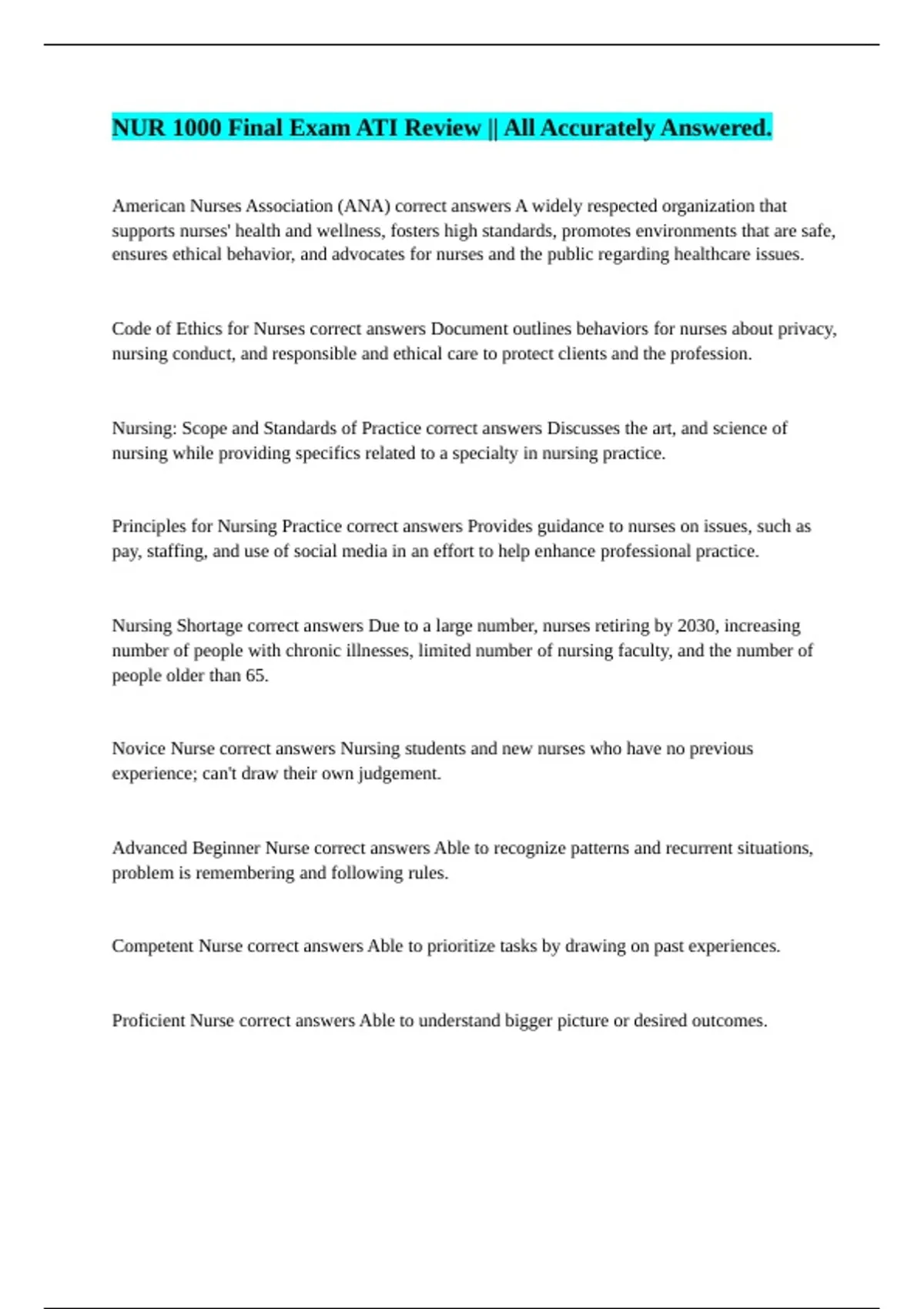 NUR 1000 Final Exam ATI Review || All Accurately Answered.