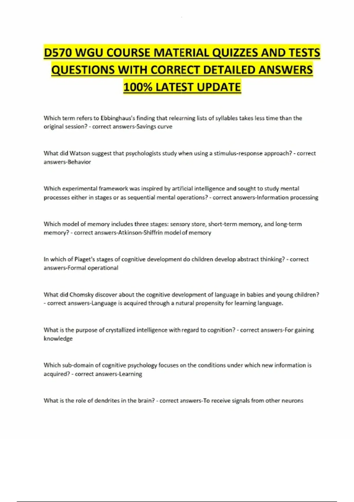 D570 WGU COURSE MATERIAL QUIZZES AND TESTS QUESTIONS WITH CORRECT DETAILED ANSWERS 100% LATEST UPDATE Which term refers to Ebbinghaus's finding that relearning lists of syllables takes less time than the original session? - correct answers-Savings curve What did Watson suggest that psychologists study when using a stimulus-response approach? - correct answers-Behavior Which experimental framework was inspired by artificial intelligence and sought to study mental processes either in stages or as sequential mental operations? - correct answers-Information processing Which model of memory includes three stages: sensory store, short-term memory, and long-term memory? - correct answers-Atkinson-Shiffrin model of memory In which of Piaget's stages of cognitive development do children develop abstract thinking? - correct answers-Formal operational