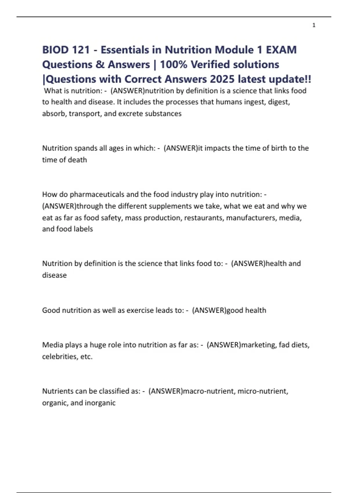 BIOD 121 - Essentials in Nutrition Module 1 EXAM