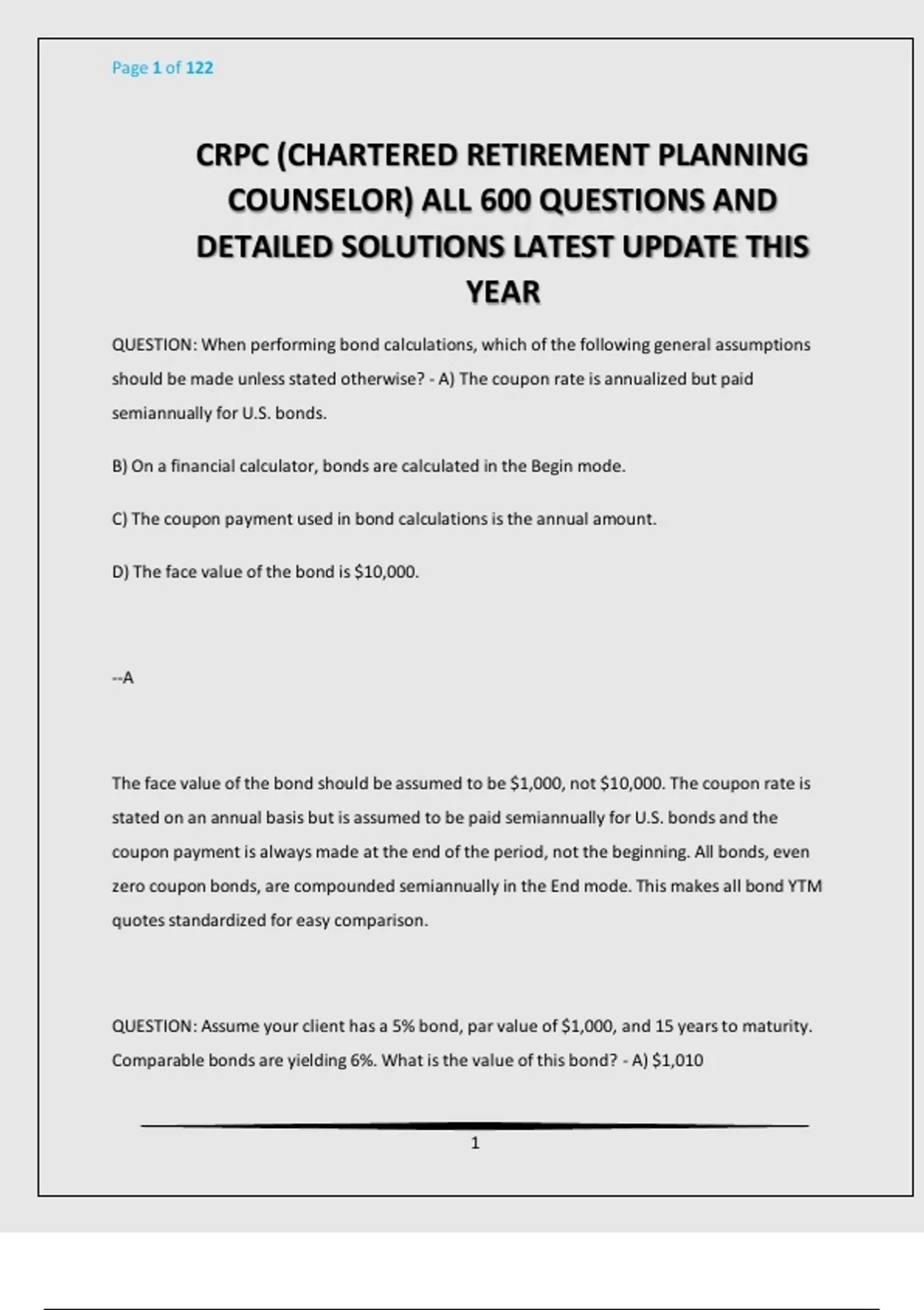 QUESTION: When performing bond calculations, which of the following general assumptions