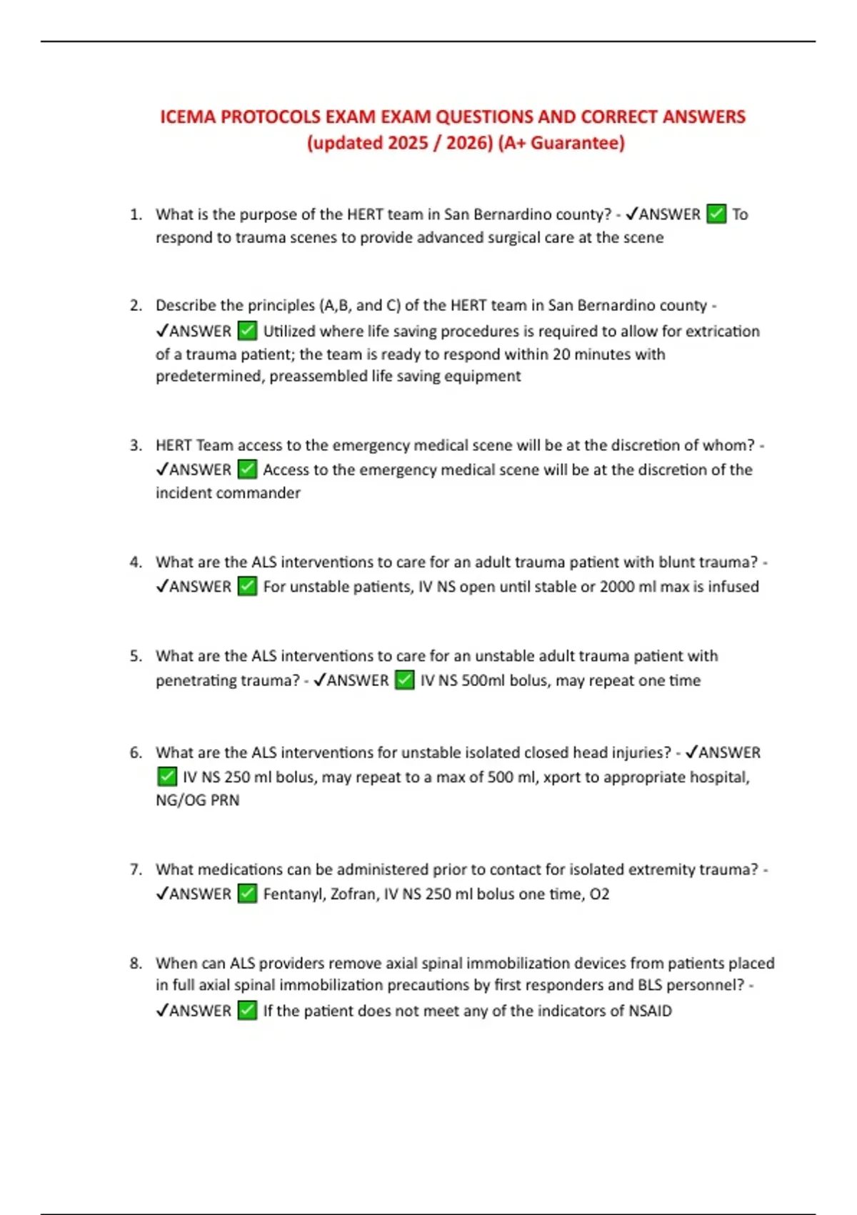 1. What is the purpose of the HERT team in San Bernardino county? - ANSWER To respond to trauma scenes to provide advanced surgical care at the scene 2. Describe the principles (A,B, and C) of the HERT team in San Bernardino county - ANSWER Utilized where life saving procedures is required to allow for extrication of a trauma patient; the team is ready to respond within 20 minutes with predetermined, preassembled life saving equipment 3. HERT Team access to the emergency medical scene will be at the discretion of whom? - ANSWER Access to the emergency medical scene will be at the discretion of the incident commander 4. What are the ALS interventions to care for an adult trauma patient with blunt trauma? - ANSWER For unstable patients, IV NS open until stable or 2000 ml max is infused 5. What are the ALS interventions to care for an unstable adult trauma patient with penetrating trauma? - ANSWER IV NS 500ml bolus, may repeat one time 6. What are the ALS interventions for unstable isolated closed head injuries? - ANSWER IV NS 250 ml bolus, may repeat to a max of 500 ml, xport to appropriate hospital, NG/OG PRN 7. What medications can be administered prior to contact for isolated extremity trauma? - ANSWER Fentanyl, Zofran, IV NS 250 ml bolus one time, O2 8. When can ALS providers remove axial spinal immobilization devices from patients placed in full axial spinal immobilization precautions by first responders and BLS personnel? - ANSWER If the patient does not meet any of the indicators of NSAID 9. You are considering nasotracheal intubation on your adult (>15 years of age) patient who has significant facial trauma, what must be done prior to performing this skill? - ANSWER Contact trauma base hospital for physician consult/order 10. What medication should be administered immediately prior to intubation? include dose(S) - ANSWER Prophylactic lidocaine 1.5mg/kg IV/IO 11. When should an advanced airway be considered In a newborn? - ANSWER When BVM is ineffective or tracheal suctioning is required 12. Obtain blood glucose by heel stick, if blood glucose <35 mg/dl, how will this be corrected? - ANSWER Administer dextrose 10%/250 ml 0.5 gm/kg 5ml/kg, IV/IO 13. Which of the following must be submitted for EMT-P certification BEFORE being scheduled for the ICEMA exam? - ANSWER All of the above 14. What is the definition of the scope of an MCI? (how does ICEMA define an MCI) - ANSWER Incident requires 5 or more units, involves 10 or more patients, require the use of triage tags, pts may be distributed to more than one hospital. 15. When using the START system, patients are triaged based on which three physical assessments? - ANSWER Respirations, perfusion, mental status 16. What triage criteria constitutes trauma base contact? - ANSWER Patients meeting all trauma triage criteria; trauma base station contact shall be made 17. What is the expected on scene time (under normal circumstances) on trauma calls? - ANSWER 5-10 minutes
